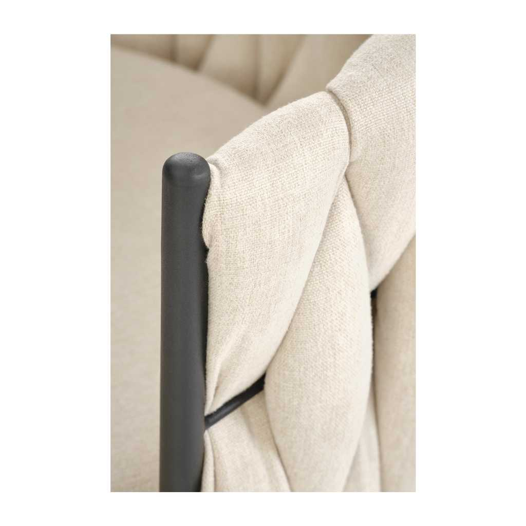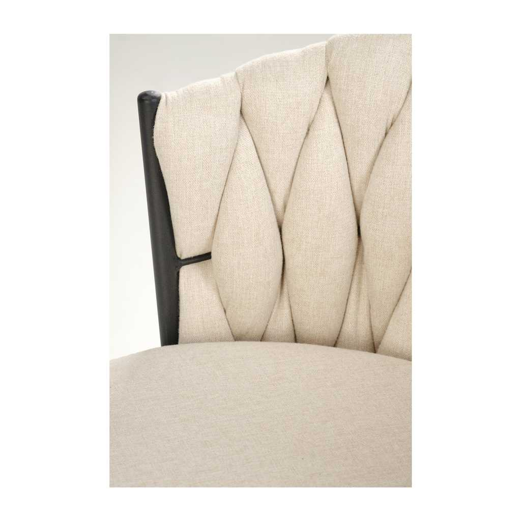 Sedák i opěradlo jsou potažené látkou. U opěráku má čalounění podobu pruhů propletených mezi výztuhami – ty jsou stejně jako nohy židle z práškované ocele v černé barvě.