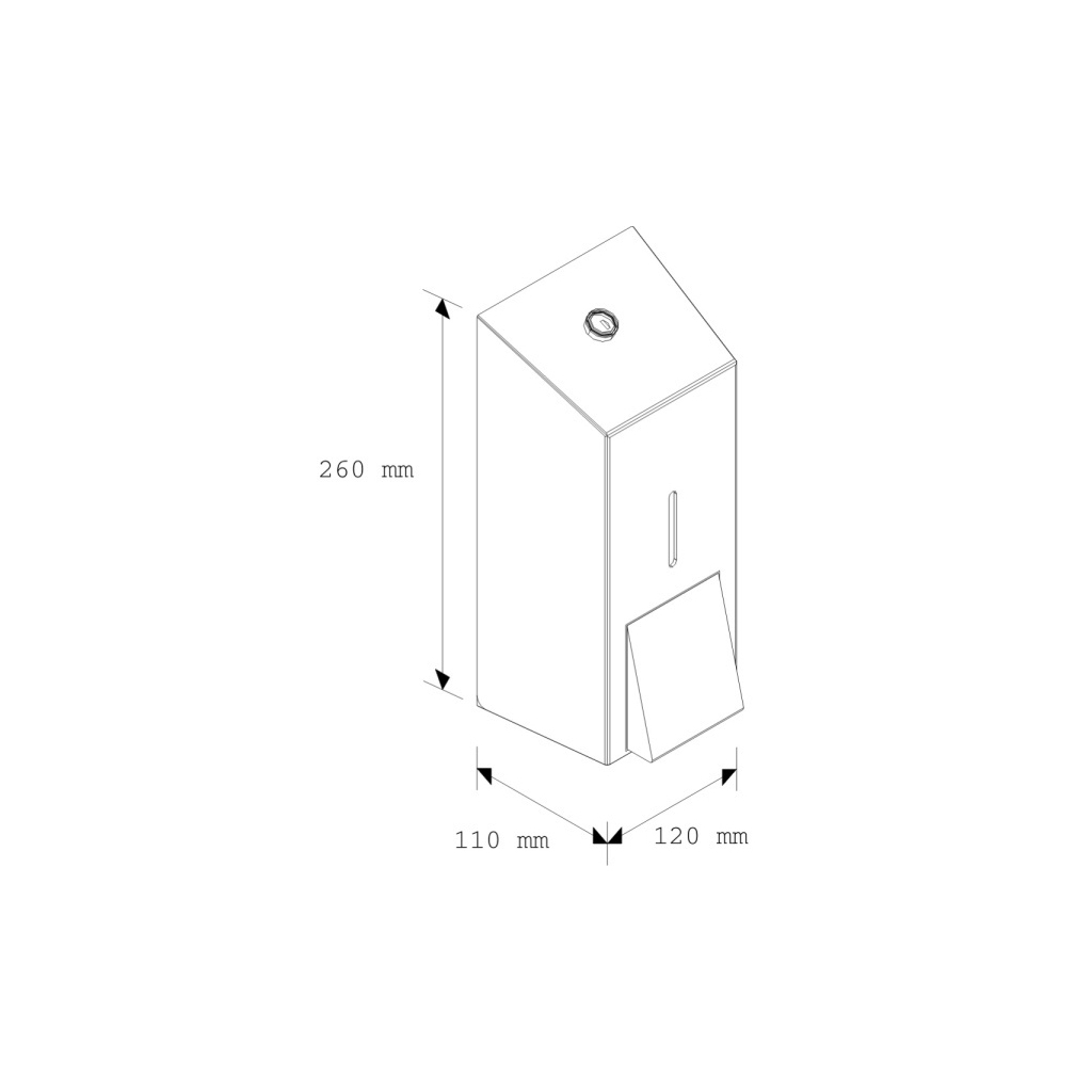 Dávkovač je uzamykatelný, nemusíte se tak bát případné krádeže vloženého spotřebního materiálu. Umisťuje se na zeď a ovládá se pomocí páky na loket. Nemusíte se tak dávkovače dotýkat a obávat se šíření bakterií a virů. Je vyrobený z matové nerezové oceli se zabroušenými hranami.