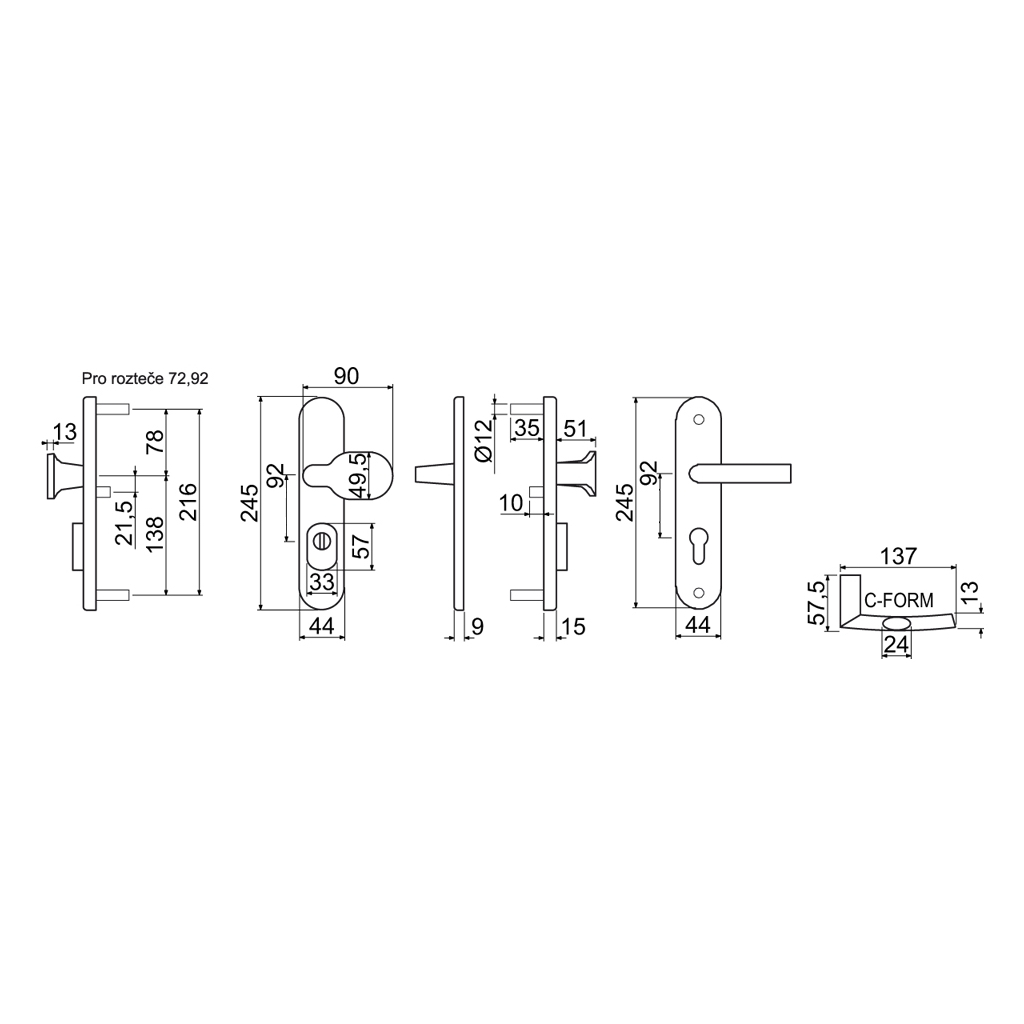 Kování dodáváme standardně ve tvaru „C-FORM“. Výkovek štítu a rozeta jsou kalené na tvrdost 50 HRC. Kování disponuje navíc certifikací v bezpečnostní třídě RC3 a certifikátem NBÚ typ 3 SS4=2. Pro správnou funkci kování je třeba, aby cylindrická vložka přesahovala vnější okraj dveří o 15–18 mm.