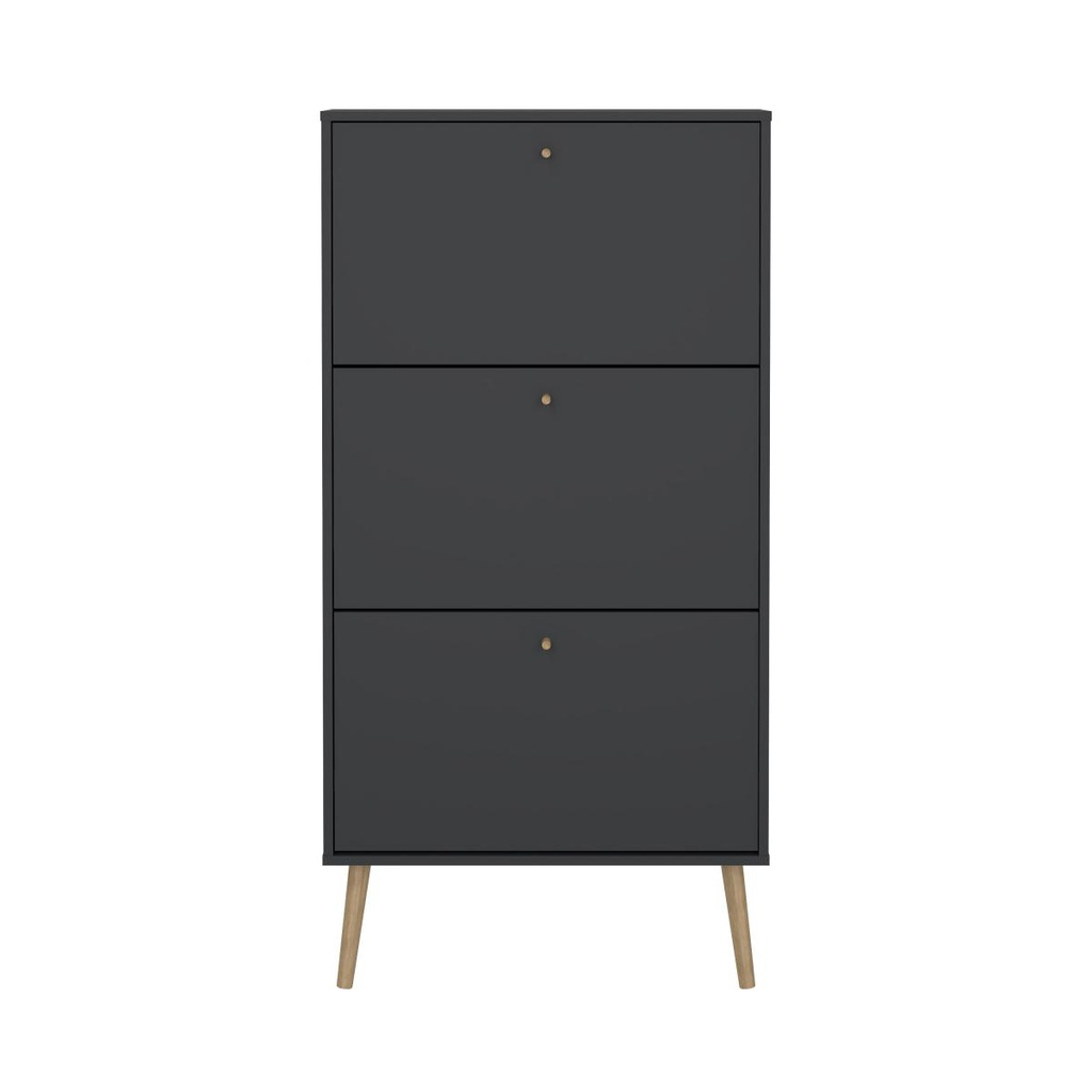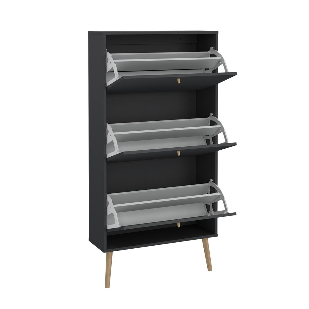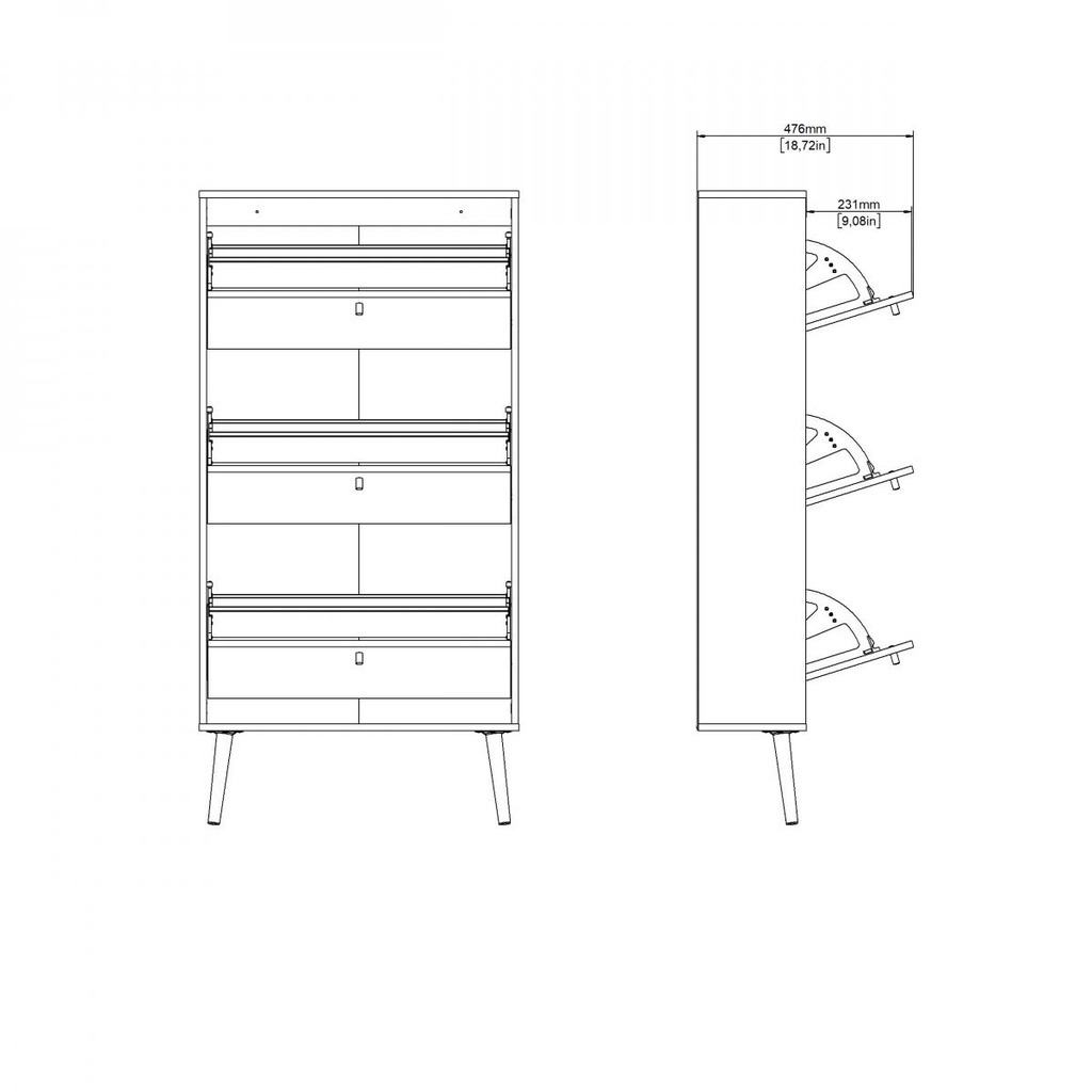 Výrobek je vyroben z kvalitního dřeva a stojí na pevných nohách z masivního dubového dřeva, které dodávají celému kusu nábytku stabilitu a přírodní vzhled. Díky třem prostorným sklopným přihrádkám získáte dostatek místa pro efektivní uskladnění bot a dalšího drobného příslušenství.