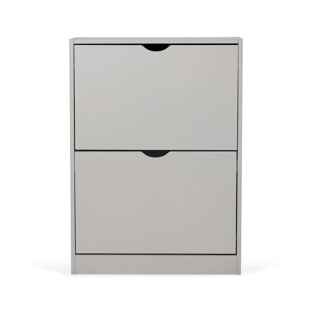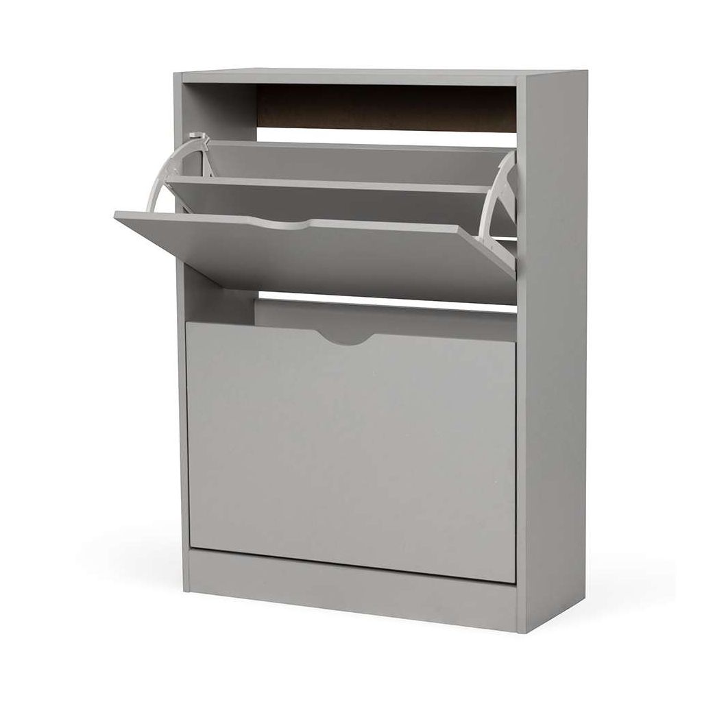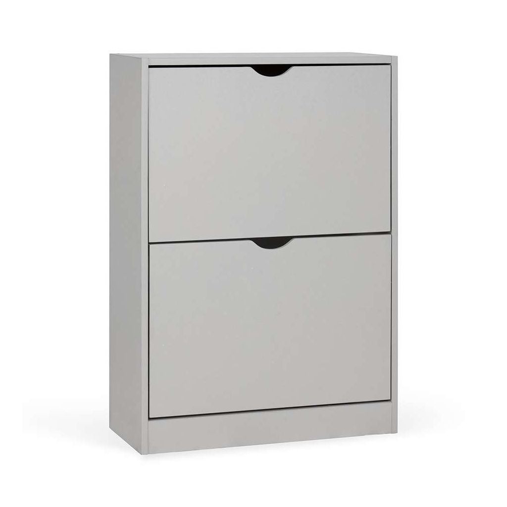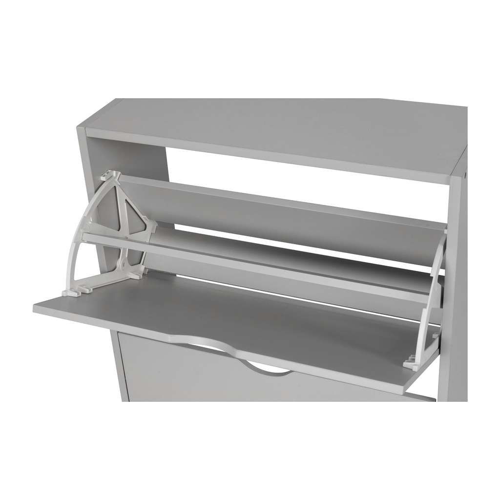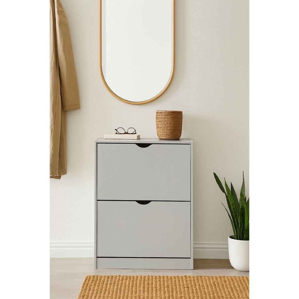 Díky dvěma výklopným přihrádkám snadno umístíte a vyjmete boty, přičemž jednoduché otevírání pomocí výřezů nahrazuje klasické úchytky a přispívá k minimalistickému vzhledu botníku. Pevná a stabilní konstrukce z dřevěného materiálu zajišťuje dlouhodobou odolnost při každodenním používání.