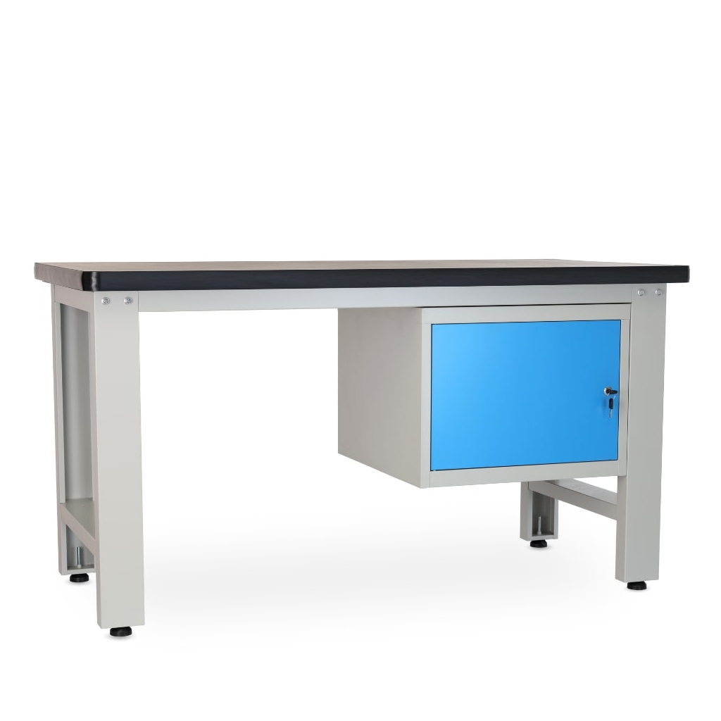 Stůl se chlubí úložným modulem, kam si odložíte nářadí nebo součástky, které zrovna nepotřebujete na stole. Dvířka jsou lakovaná standardním odstínem RAL 5012, aby dokonale ladila i s dalším dílenským nábytkem.