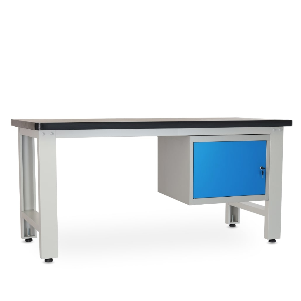 Stůl se chlubí úložným modulem, kam si odložíte nářadí nebo součástky, které zrovna nepotřebujete na stole. Dvířka jsou lakovaná standardním odstínem RAL 5012, aby dokonale ladila i s dalším dílenským nábytkem.