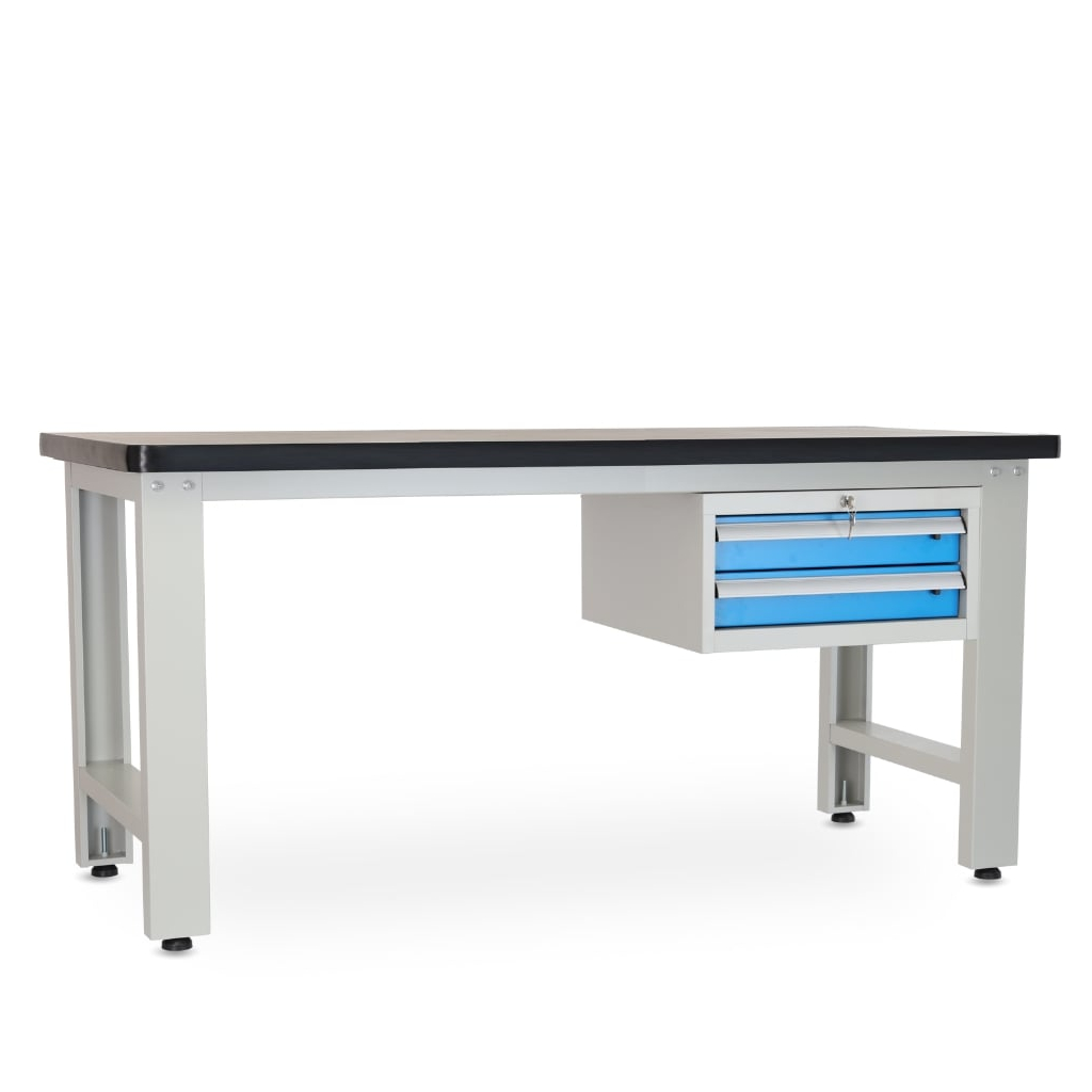 Stůl se chlubí úložným modulem, kam si odložíte nářadí nebo součástky, které zrovna nepotřebujete na stole. Dvířka jsou lakovaná standardním odstínem RAL 5012, aby dokonale ladila i s dalším dílenským nábytkem.