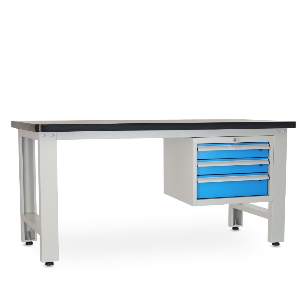 Stůl se chlubí úložným modulem, kam si odložíte nářadí nebo součástky, které zrovna nepotřebujete na stole. Dvířka jsou lakovaná standardním odstínem RAL 5012, aby dokonale ladila i s dalším dílenským nábytkem.