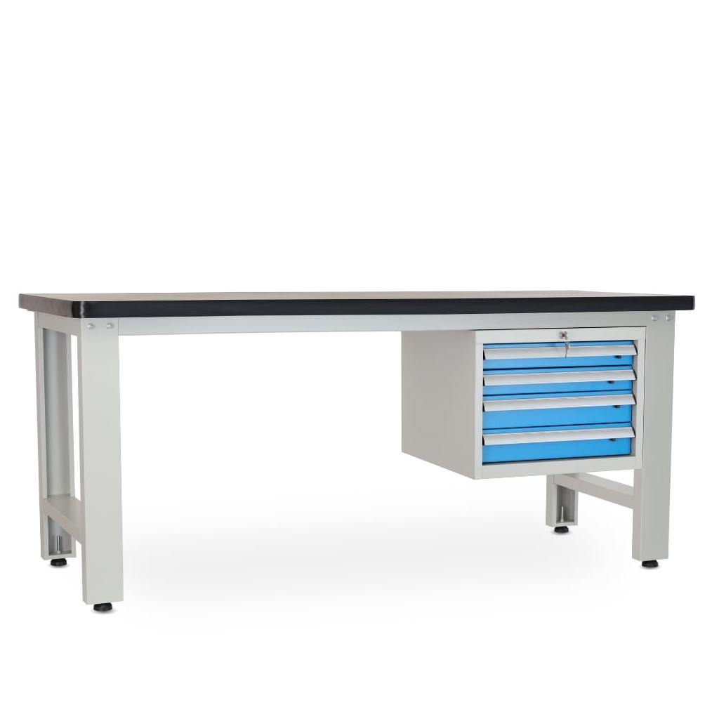 Stůl se chlubí úložným modulem, kam si odložíte nářadí nebo součástky, které zrovna nepotřebujete na stole. Dvířka jsou lakovaná standardním odstínem RAL 5012, aby dokonale ladila i s dalším dílenským nábytkem.