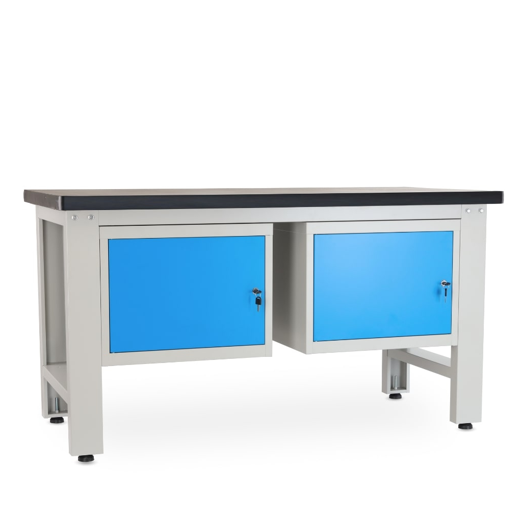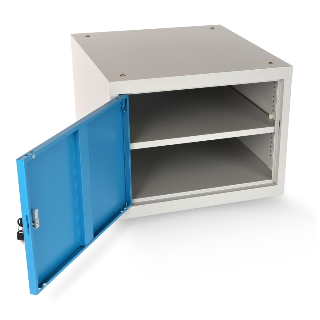Stůl se chlubí úložnými moduly na obou stranách, kam si odložíte nářadí nebo součástky, které zrovna nepotřebujete na stole. Dvířka jsou lakovaná standardním odstínem RAL 5012, aby dokonale ladila i s dalším dílenským nábytkem.