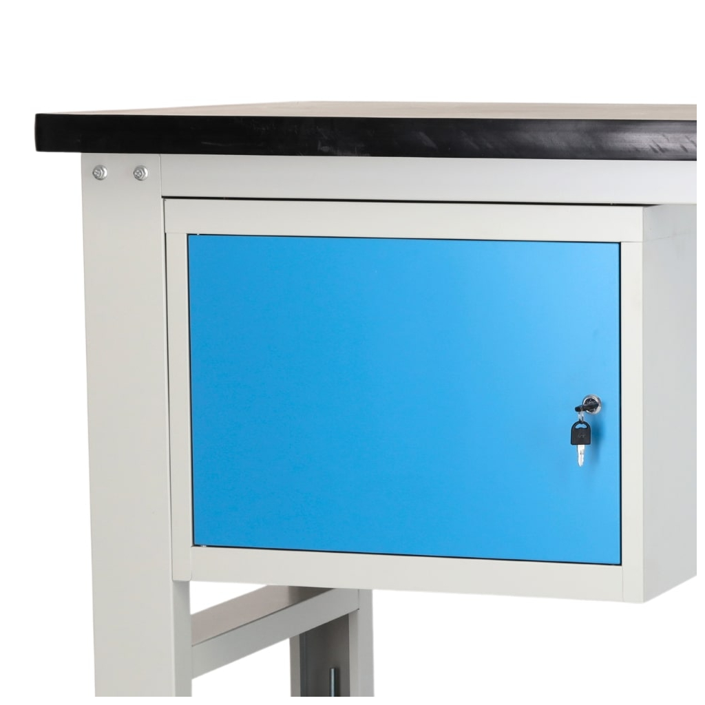 Stůl se chlubí úložnými moduly na obou stranách, kam si odložíte nářadí nebo součástky, které zrovna nepotřebujete na stole. Dvířka jsou lakovaná standardním odstínem RAL 5012, aby dokonale ladila i s dalším dílenským nábytkem.