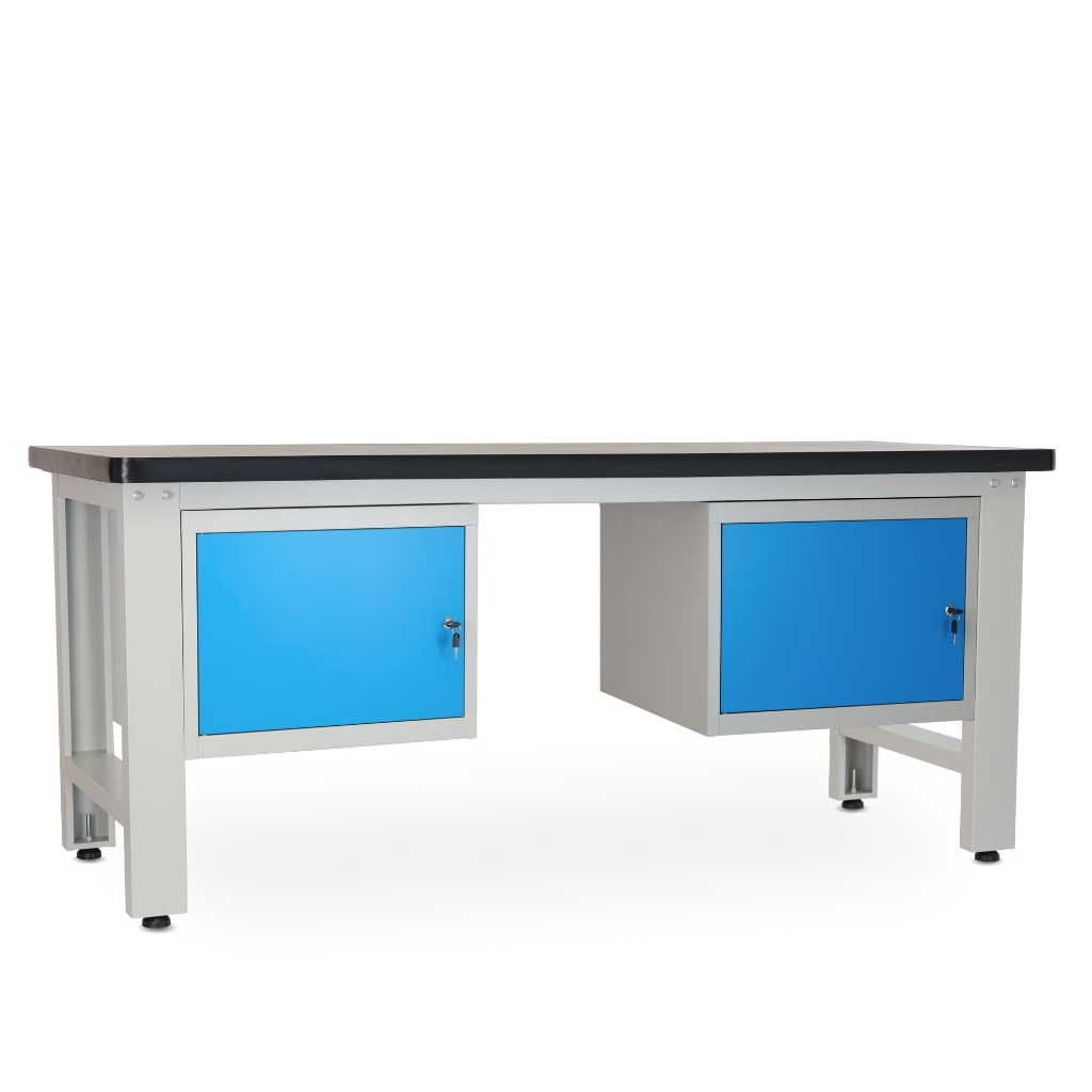 Stůl se chlubí úložnými moduly na obou stranách, kam si odložíte nářadí nebo součástky, které zrovna nepotřebujete na stole. Dvířka jsou lakovaná standardním odstínem RAL 5012, aby dokonale ladila i s dalším dílenským nábytkem.