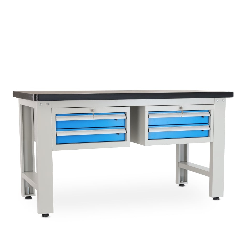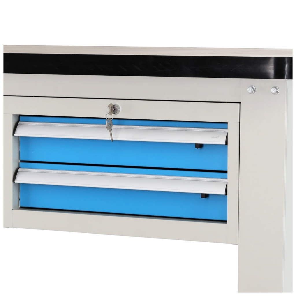 Stůl se chlubí úložnými moduly na obou stranách, kam si odložíte nářadí nebo součástky, které zrovna nepotřebujete na stole. Dvířka jsou lakovaná standardním odstínem RAL 5012, aby dokonale ladila i s dalším dílenským nábytkem.