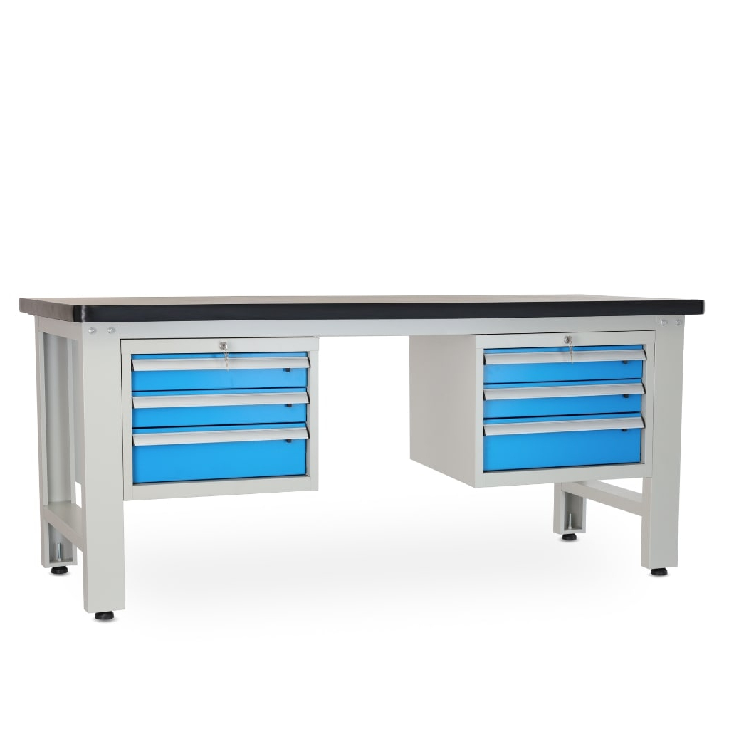 Stůl se chlubí úložnými moduly na obou stranách, kam si odložíte nářadí nebo součástky, které zrovna nepotřebujete na stole. Dvířka jsou lakovaná standardním odstínem RAL 5012, aby dokonale ladila i s dalším dílenským nábytkem.