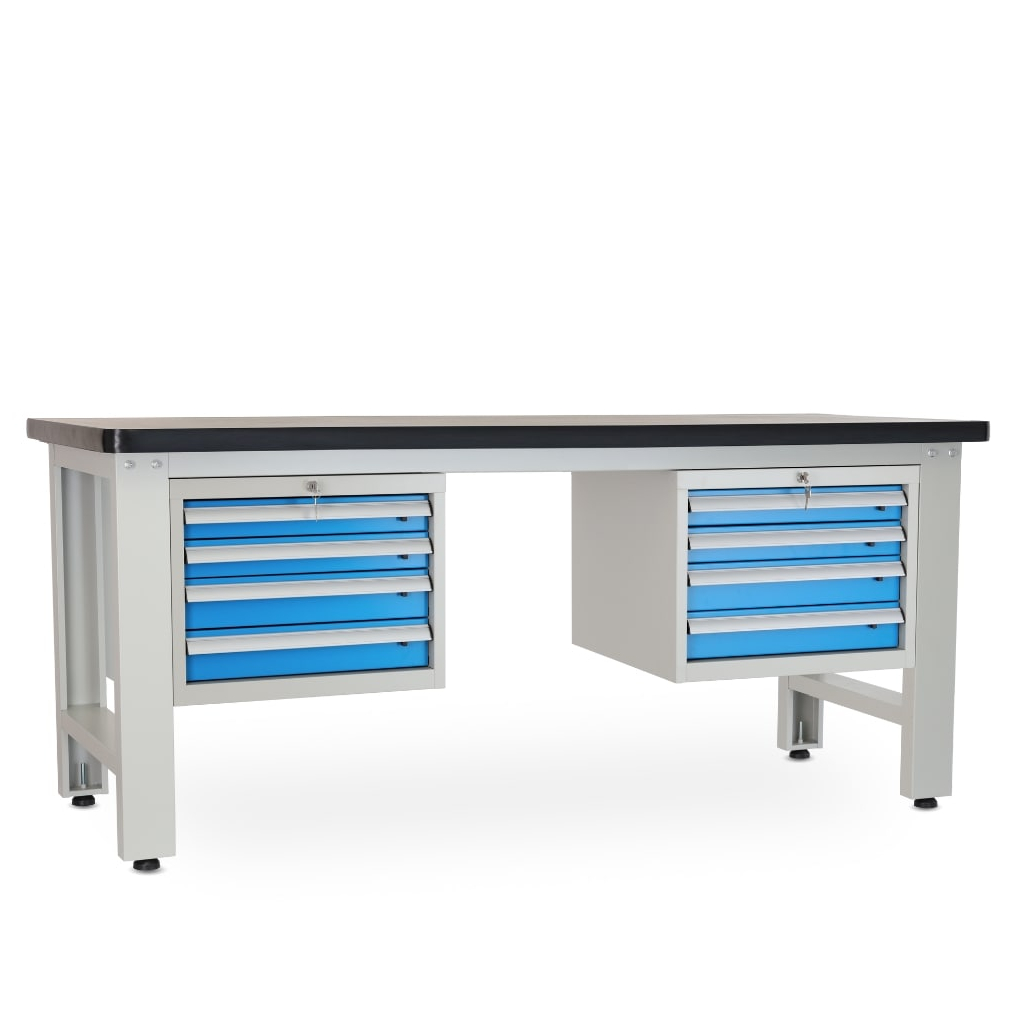 Stůl se chlubí úložnými moduly na obou stranách, kam si odložíte nářadí nebo součástky, které zrovna nepotřebujete na stole. Dvířka jsou lakovaná standardním odstínem RAL 5012, aby dokonale ladila i s dalším dílenským nábytkem.