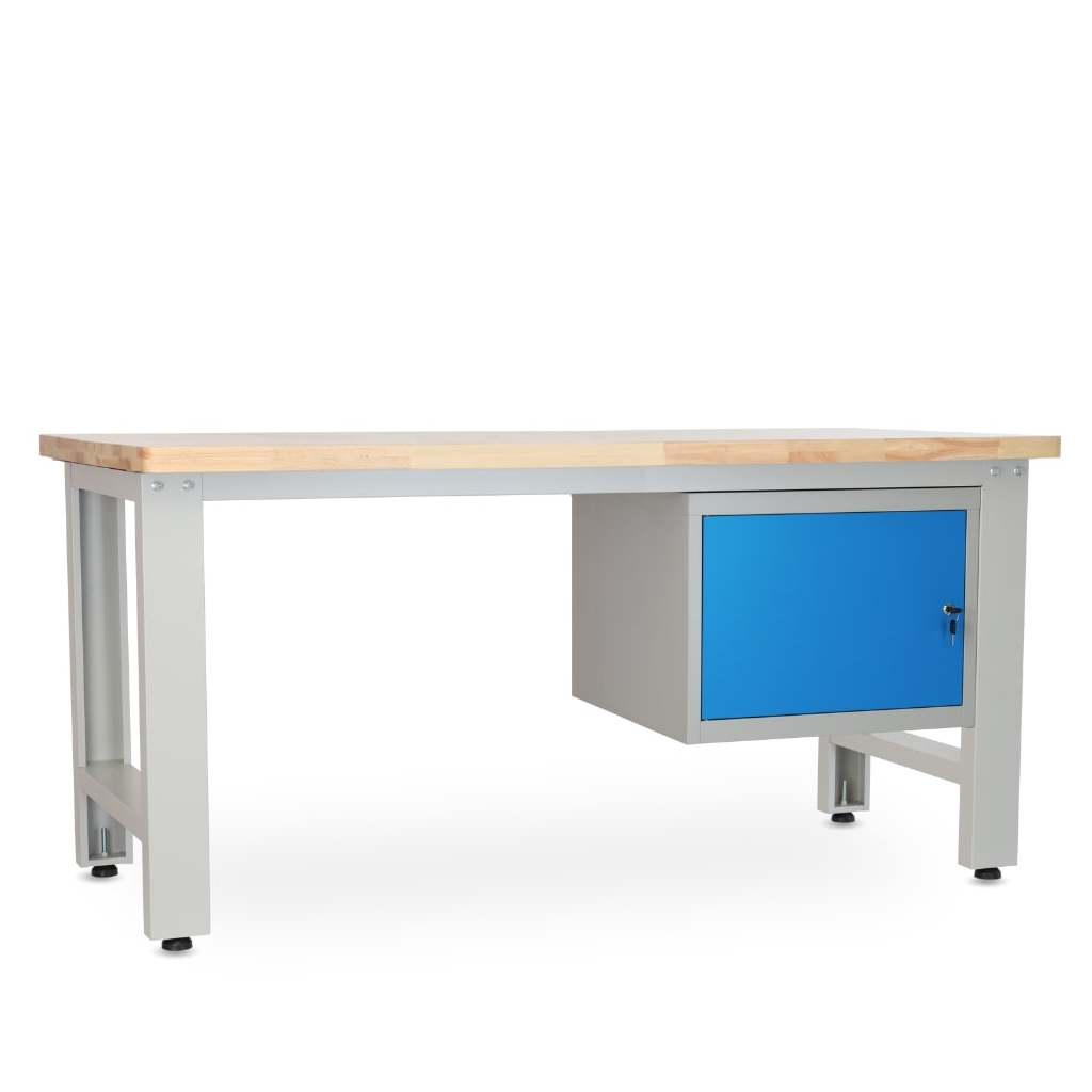 Stůl se chlubí úložným modulem, kam si odložíte nářadí nebo součástky, které zrovna nepotřebujete na stole. Dvířka jsou lakovaná standardním odstínem RAL 5012, aby dokonale ladila i s dalším dílenským nábytkem.