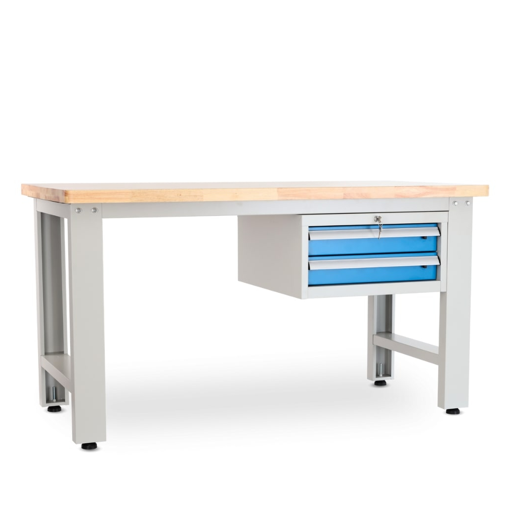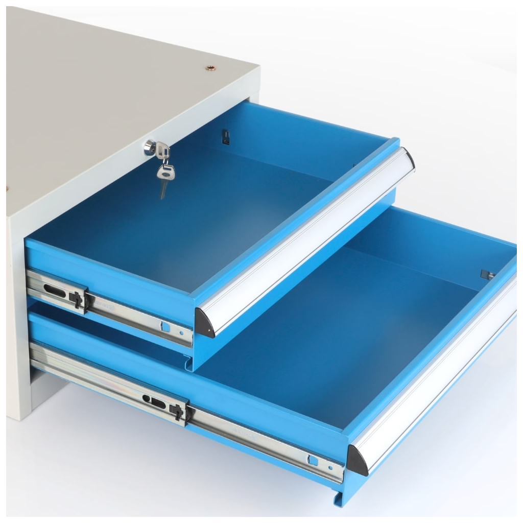 Stůl se chlubí úložným modulem, kam si odložíte nářadí nebo součástky, které zrovna nepotřebujete na stole. Dvířka jsou lakovaná standardním odstínem RAL 5012, aby dokonale ladila i s dalším dílenským nábytkem.