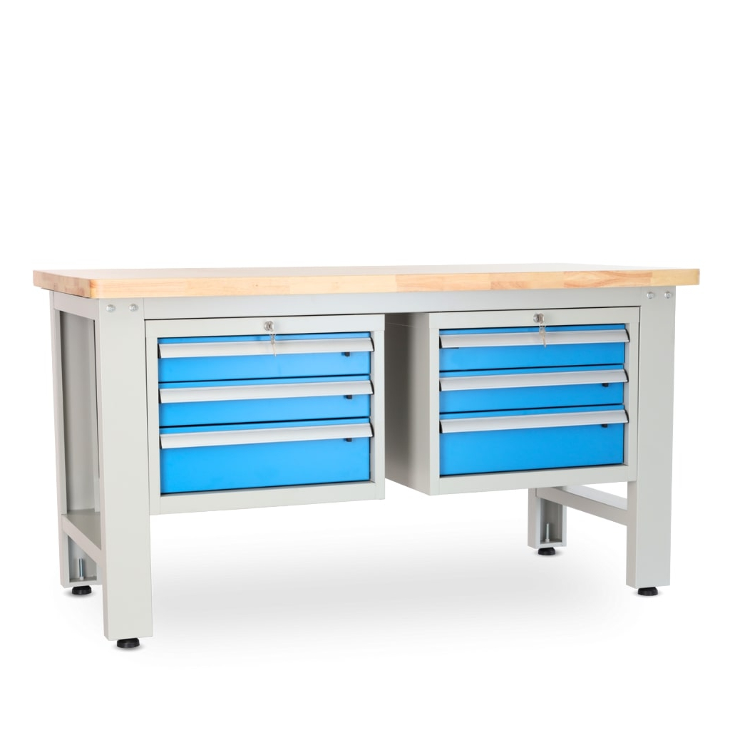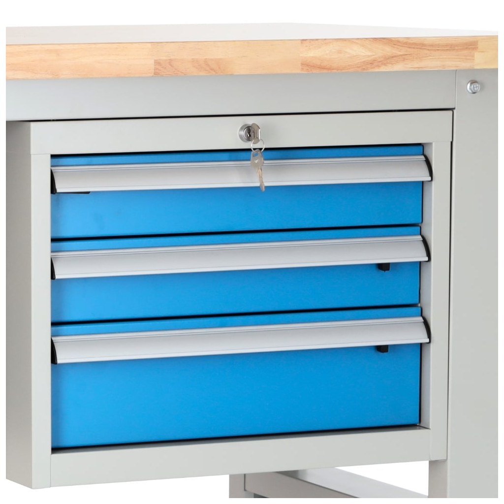 Stůl se chlubí úložnými moduly na obou stranách, kam si odložíte nářadí nebo součástky, které zrovna nepotřebujete na stole. Dvířka jsou lakovaná standardním odstínem RAL 5012, aby dokonale ladila i s dalším dílenským nábytkem.