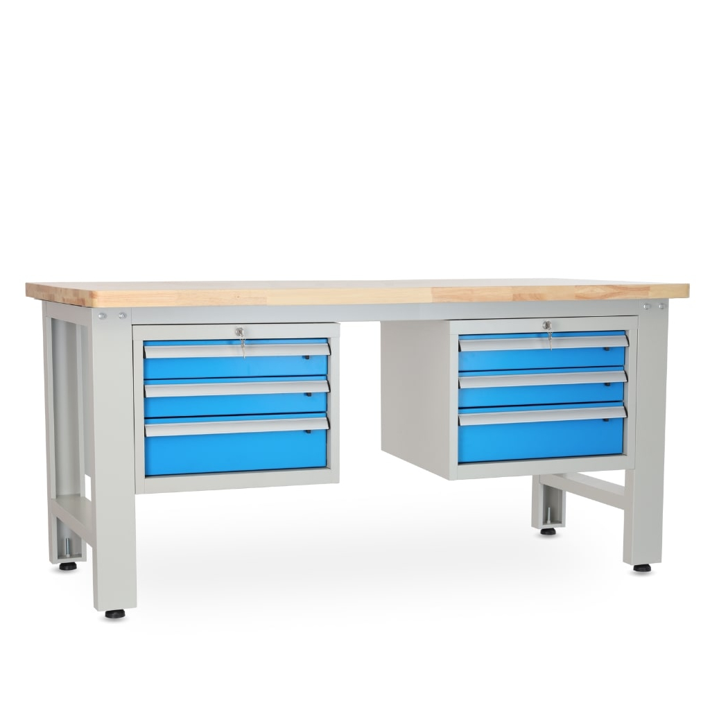 Stůl se chlubí úložnými moduly na obou stranách, kam si odložíte nářadí nebo součástky, které zrovna nepotřebujete na stole. Dvířka jsou lakovaná standardním odstínem RAL 5012, aby dokonale ladila i s dalším dílenským nábytkem.