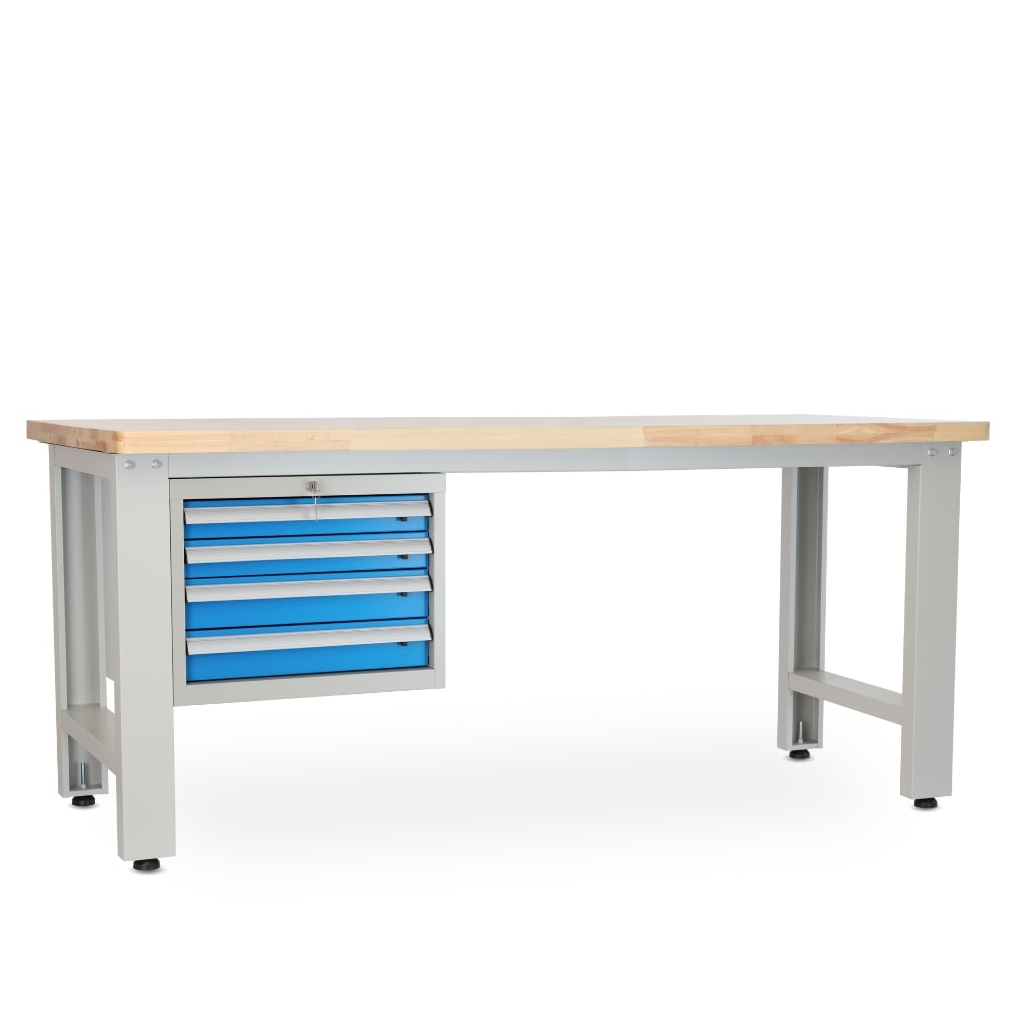Stůl se chlubí úložným modulem, kam si odložíte nářadí nebo součástky, které zrovna nepotřebujete na stole. Dvířka jsou lakovaná standardním odstínem RAL 5012, aby dokonale ladila i s dalším dílenským nábytkem.