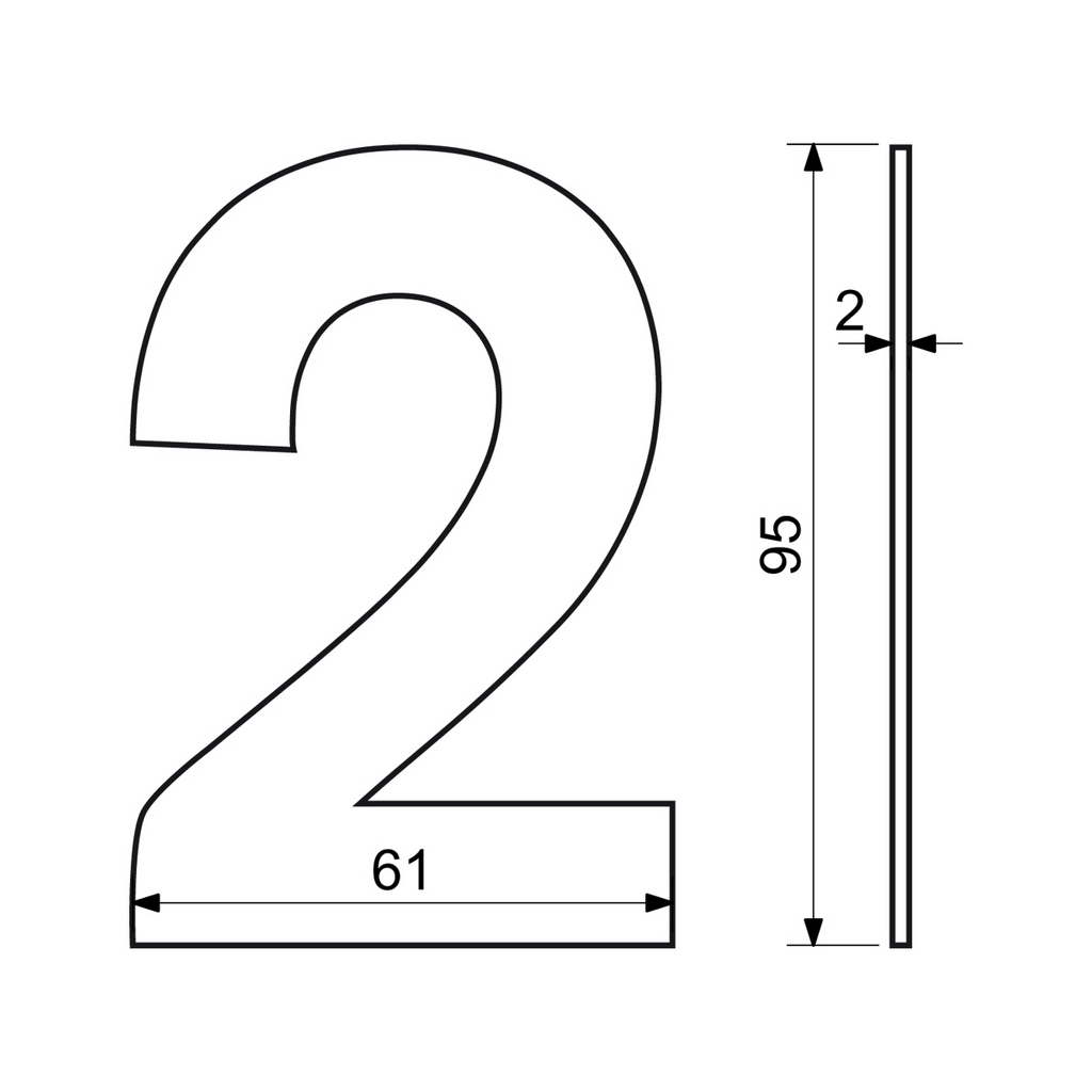 Domovní číslo "2" ve 2D provedení využijete při identifikaci objektů - jako součást popisného čísla na fasádě domu, firmy či jiných budov. Je vyrobené z nerezové oceli. Všechna čísla a znaky z této řady mají stejnou výšku i tloušťku. Poskládáte si tak popisné a orientační číslo v jednom stylu. Tento typ domovního čísla je vhodný pro instalaci na středně hrubé a hladké povrchy.