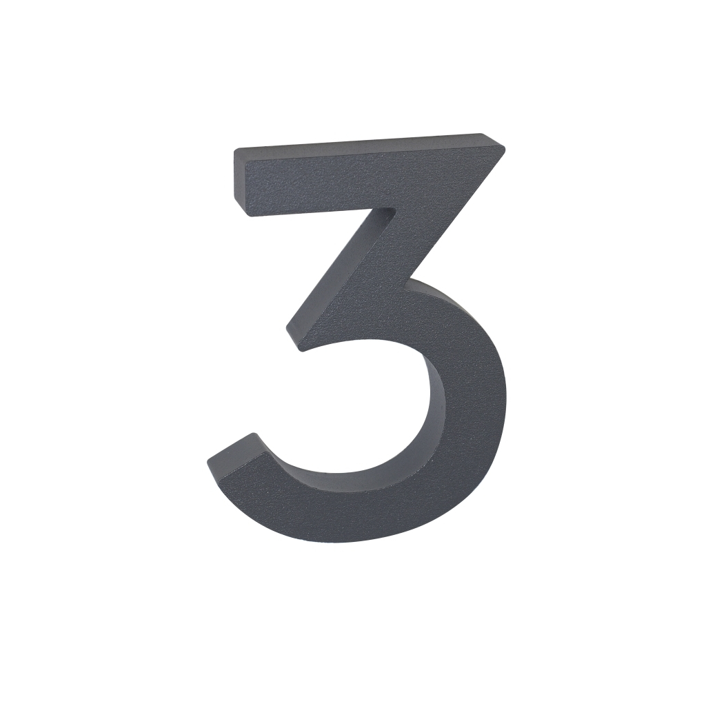 Domovní číslo "3" využijete při identifikaci objektů - jako součást popisného čísla na fasádě domu, firmy či jiných budov. Je vyrobené z hliníku a má strukturovaný povrch v barvě matného antracitu. Všechna čísla a znaky z této řady mají stejnou výšku i tloušťku. Poskládáte si tak popisné a orientační číslo v jednom stylu.
