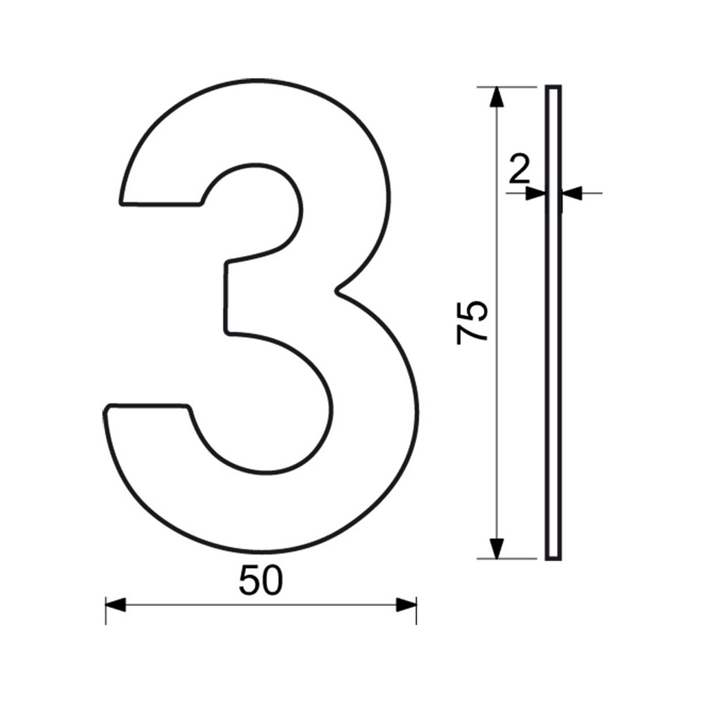 Domovní číslo "3" ve 2D provedení využijete při identifikaci objektů - jako součást popisného čísla na fasádě domu, firmy či jiných budov. Je vyrobené z nerezové oceli. Všechna čísla a znaky z této řady mají stejnou výšku i tloušťku. Poskládáte si tak popisné a orientační číslo v jednom stylu. Tento typ domovního čísla je vhodný pro instalaci na středně hrubé a hladké povrchy.