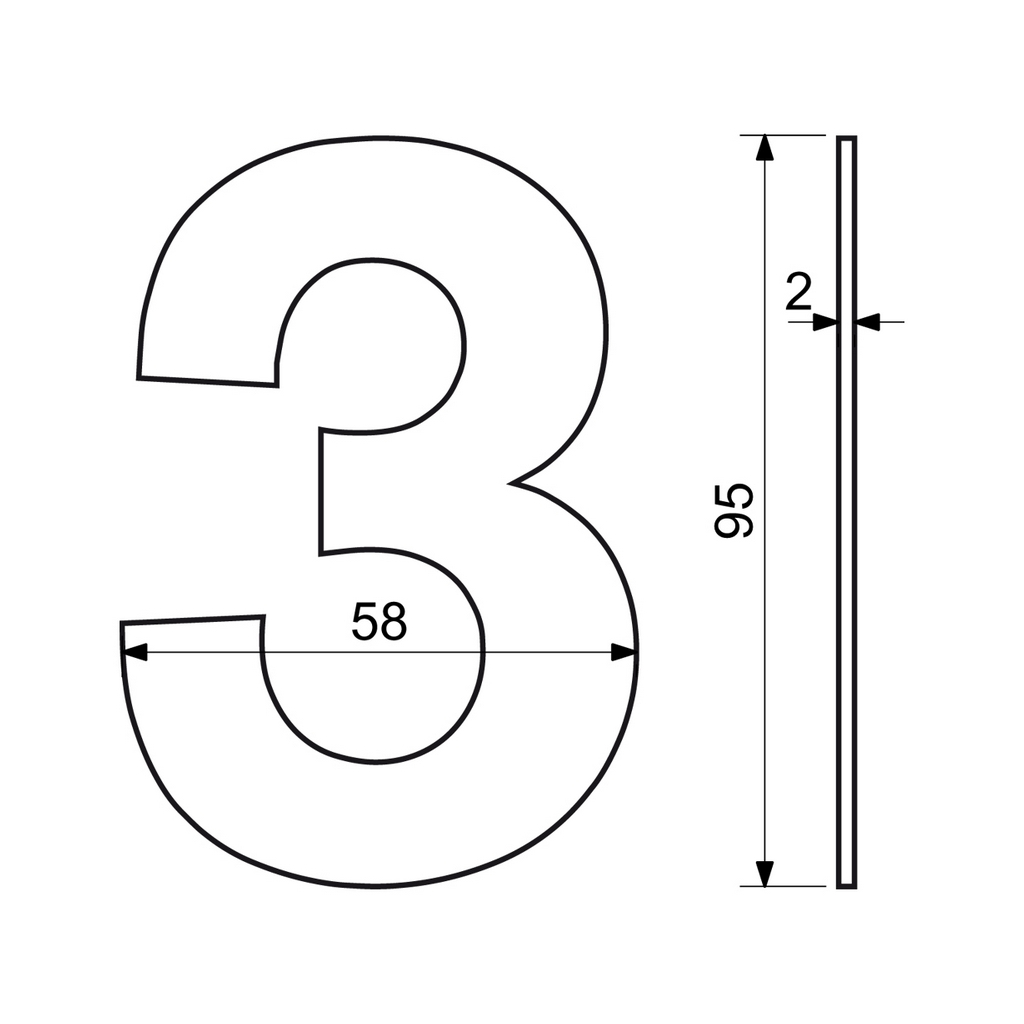 Domovní číslo "3" ve 2D provedení využijete při identifikaci objektů - jako součást popisného čísla na fasádě domu, firmy či jiných budov. Je vyrobené z nerezové oceli. Všechna čísla a znaky z této řady mají stejnou výšku i tloušťku. Poskládáte si tak popisné a orientační číslo v jednom stylu. Tento typ domovního čísla je vhodný pro instalaci na středně hrubé a hladké povrchy.