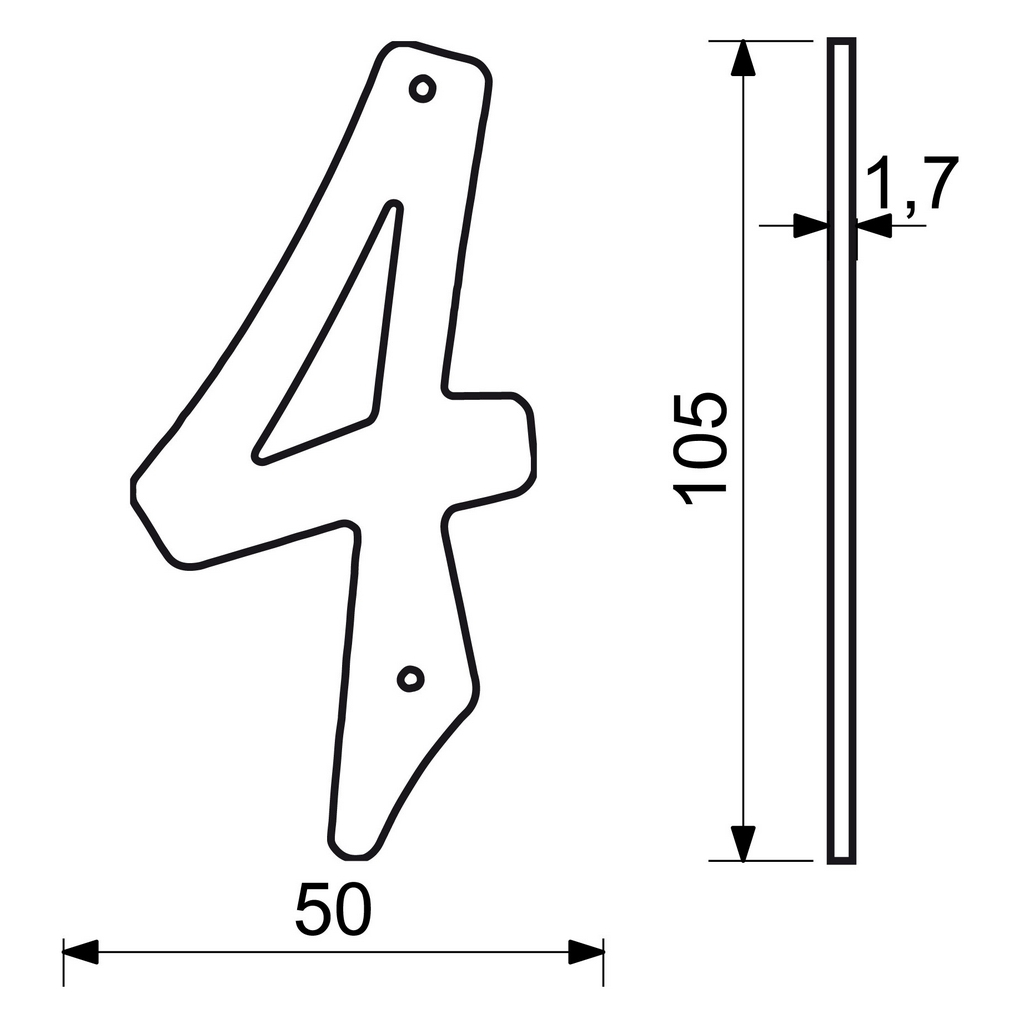 Ozdobné domovní číslo "4" ve 2D provedení využijete při identifikaci objektů - jako součást popisného čísla na fasádě domu, firmy či jiných budov. Je vyrobené z hliníku. Všechna čísla a znaky z této řady mají stejnou výšku i tloušťku. Poskládáte si tak popisné a orientační číslo v jednom stylu. Tento typ domovního čísla je vhodný pro instalaci na hladké dřevěné nebo plastové podklady.