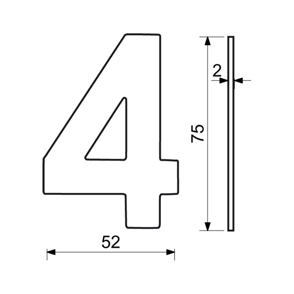 Domovní číslo "4" ve 2D provedení využijete při identifikaci objektů - jako součást popisného čísla na fasádě domu, firmy či jiných budov. Je vyrobené z nerezové oceli. Všechna čísla a znaky z této řady mají stejnou výšku i tloušťku. Poskládáte si tak popisné a orientační číslo v jednom stylu. Tento typ domovního čísla je vhodný pro instalaci na středně hrubé a hladké povrchy.