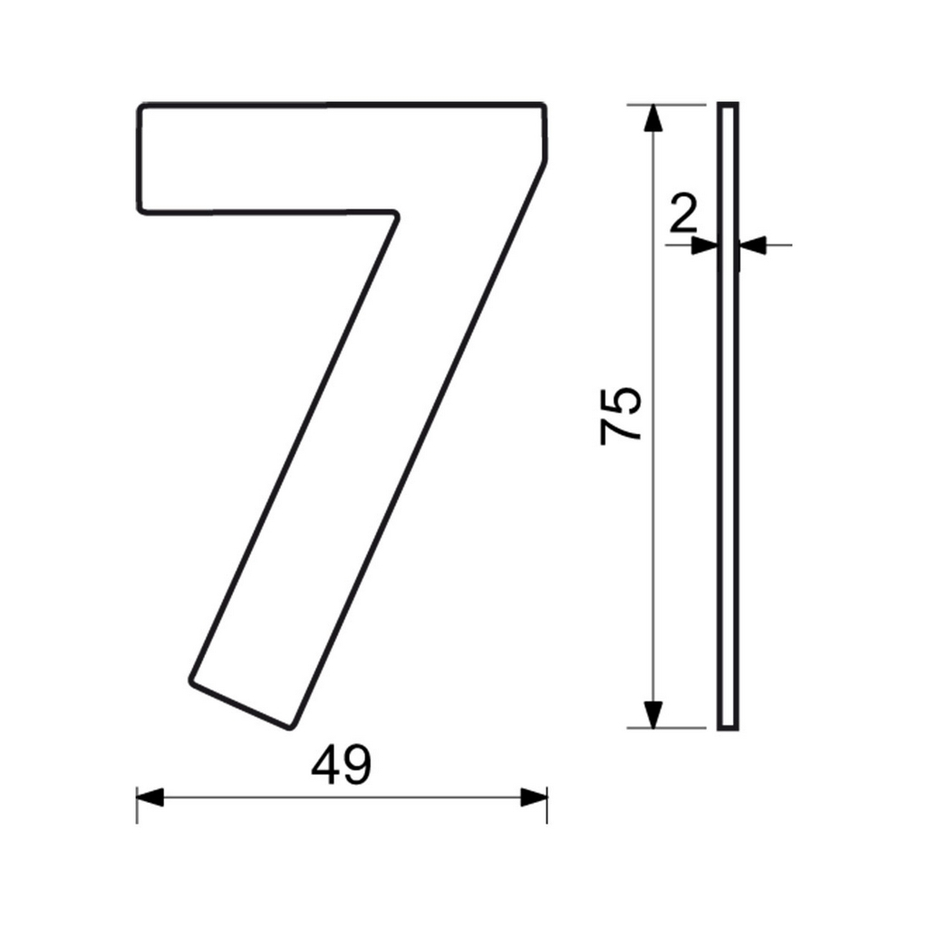 Domovní číslo "7" ve 2D provedení využijete při identifikaci objektů - jako součást popisného čísla na fasádě domu, firmy či jiných budov. Je vyrobené z nerezové oceli. Všechna čísla a znaky z této řady mají stejnou výšku i tloušťku. Poskládáte si tak popisné a orientační číslo v jednom stylu. Tento typ domovního čísla je vhodný pro instalaci na středně hrubé a hladké povrchy.