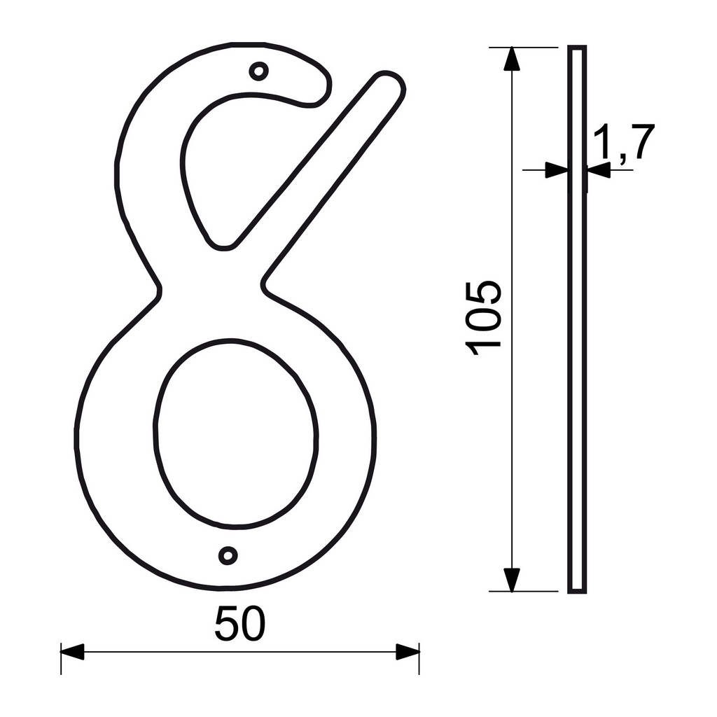 Ozdobné domovní číslo "8" ve 2D provedení využijete při identifikaci objektů - jako součást popisného čísla na fasádě domu, firmy či jiných budov. Je vyrobené z hliníku. Všechna čísla a znaky z této řady mají stejnou výšku i tloušťku. Poskládáte si tak popisné a orientační číslo v jednom stylu. Tento typ domovního čísla je vhodný pro instalaci na hladké dřevěné nebo plastové podklady.