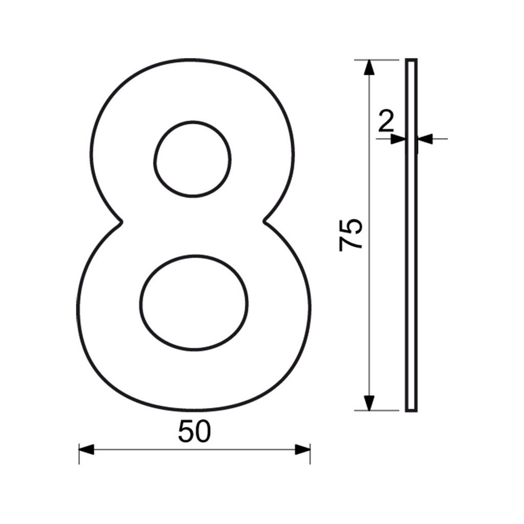 Domovní číslo "8" ve 2D provedení využijete při identifikaci objektů - jako součást popisného čísla na fasádě domu, firmy či jiných budov. Je vyrobené z nerezové oceli. Všechna čísla a znaky z této řady mají stejnou výšku i tloušťku. Poskládáte si tak popisné a orientační číslo v jednom stylu. Tento typ domovního čísla je vhodný pro instalaci na středně hrubé a hladké povrchy.