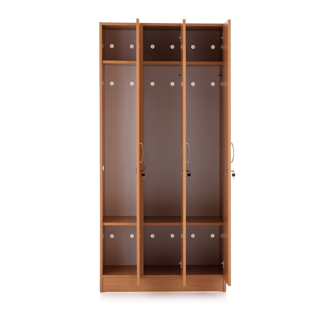 Skříň je rozdělená do 3 samostatných uzamykatelných oddílů. Uvnitř každého oddílu se nachází 3 úložné prostory oddělené 2 policemi. Spodní prostor slouží k odložení obuvi, prostřední k zavěšení vašich svršků na praktický dvojháček a vrchní úložný prostor vám poslouží k uložení osobních věcí.