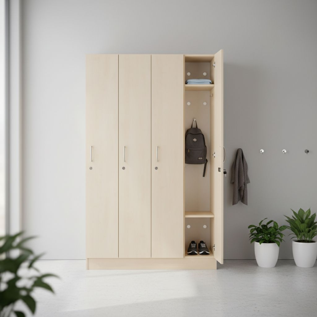 Skříň je rozdělená do 3 samostatných uzamykatelných oddílů. Uvnitř každého oddílu se nachází 3 úložné prostory oddělené 2 policemi. Spodní prostor slouží k odložení obuvi, prostřední k zavěšení vašich svršků na praktický dvojháček a vrchní úložný prostor vám poslouží k uložení osobních věcí.