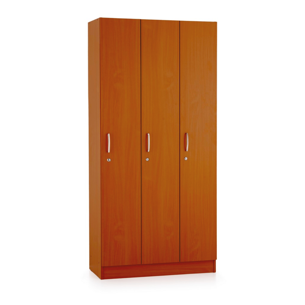 Skříň je rozdělená do 3 samostatných uzamykatelných oddílů. Uvnitř každého oddílu se nachází 3 úložné prostory oddělené 2 policemi. Spodní prostor slouží k odložení obuvi, prostřední k zavěšení vašich svršků na praktický dvojháček a vrchní úložný prostor vám poslouží k uložení osobních věcí.