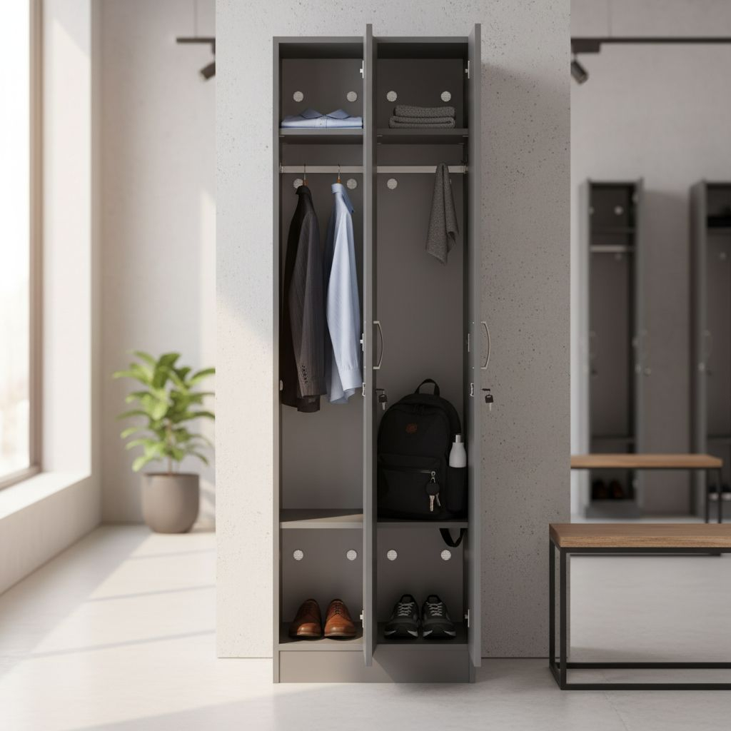 Skříň je rozdělená do 2 samostatných uzamykatelných oddílů. Uvnitř každého oddílu se nachází 3 úložné prostory oddělené 2 policemi. Spodní prostor slouží k odložení obuvi, prostřední k zavěšení vašich svršků na praktický dvojháček a vrchní úložný prostor vám poslouží k uložení osobních věcí.