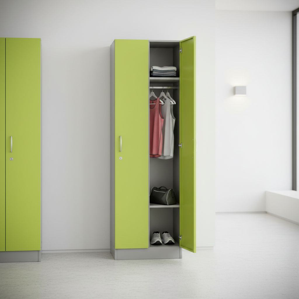 Skříň je rozdělená do 2 samostatných uzamykatelných oddílů. Uvnitř každého oddílu se nachází 3 úložné prostory oddělené 2 policemi. Spodní prostor slouží k odložení obuvi, prostřední k zavěšení vašich svršků na praktický dvojháček a vrchní úložný prostor vám poslouží k uložení osobních věcí.