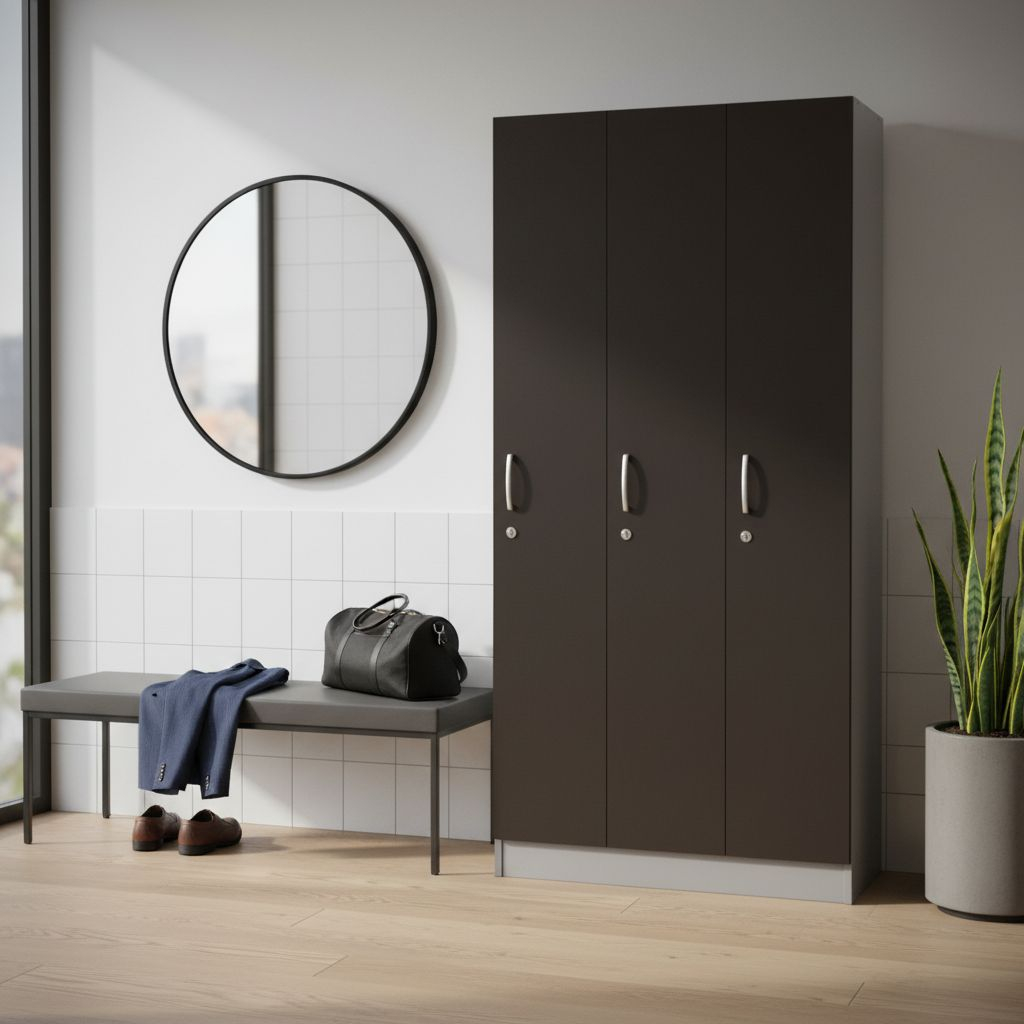 Skříň je rozdělená do 3 samostatných uzamykatelných oddílů. Uvnitř každého oddílu se nachází 3 úložné prostory oddělené 2 policemi. Spodní prostor slouží k odložení obuvi, prostřední k zavěšení vašich svršků na praktický dvojháček a vrchní úložný prostor vám poslouží k uložení osobních věcí.