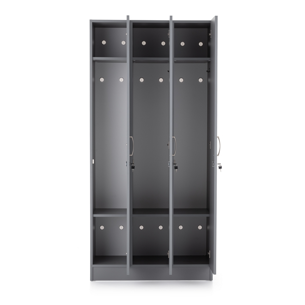 Skříň je rozdělená do 3 samostatných uzamykatelných oddílů. Uvnitř každého oddílu se nachází 3 úložné prostory oddělené 2 policemi. Spodní prostor slouží k odložení obuvi, prostřední k zavěšení vašich svršků na praktický dvojháček a vrchní úložný prostor vám poslouží k uložení osobních věcí.