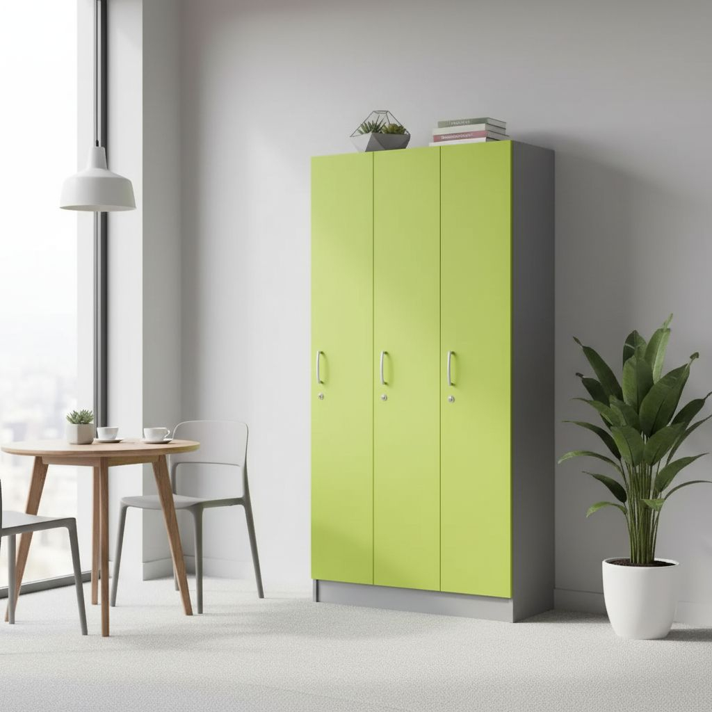 Skříň je rozdělená do 3 samostatných uzamykatelných oddílů. Uvnitř každého oddílu se nachází 3 úložné prostory oddělené 2 policemi. Spodní prostor slouží k odložení obuvi, prostřední k zavěšení vašich svršků na praktický dvojháček a vrchní úložný prostor vám poslouží k uložení osobních věcí.