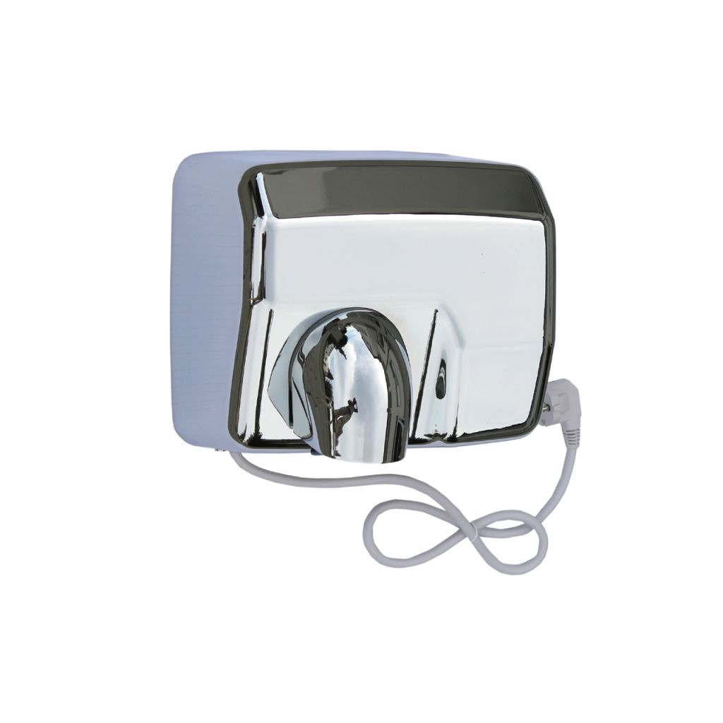 Vysoušeč se spustí bez dotyku díky snímače přiblížení rukou. Stačí tak ruce umístit pod vysoušeč a vzduch začne proudit. Kryt je vyrobený z kovu.