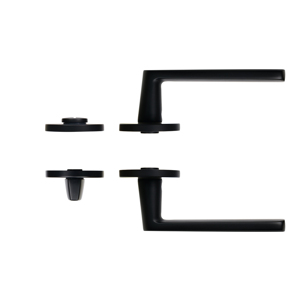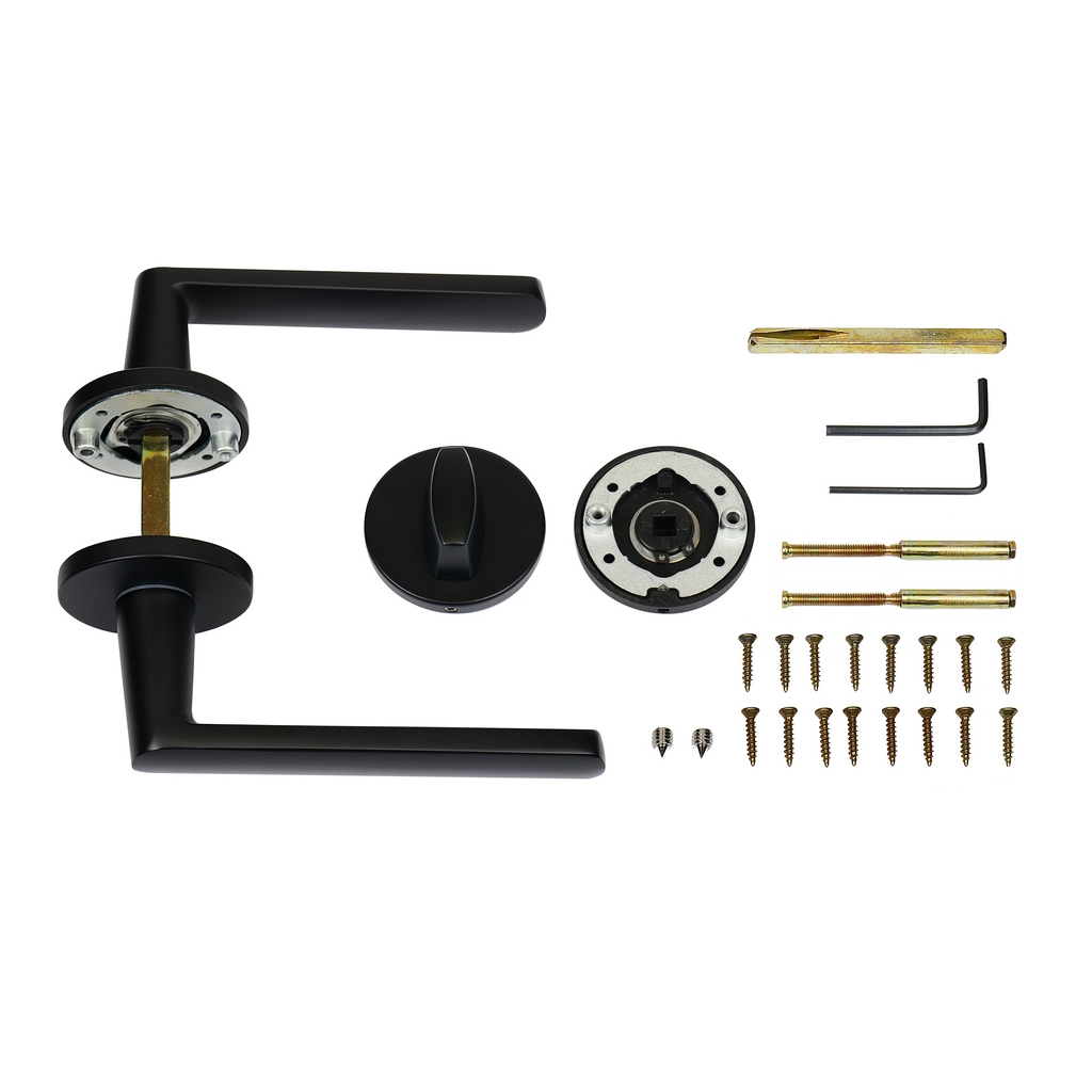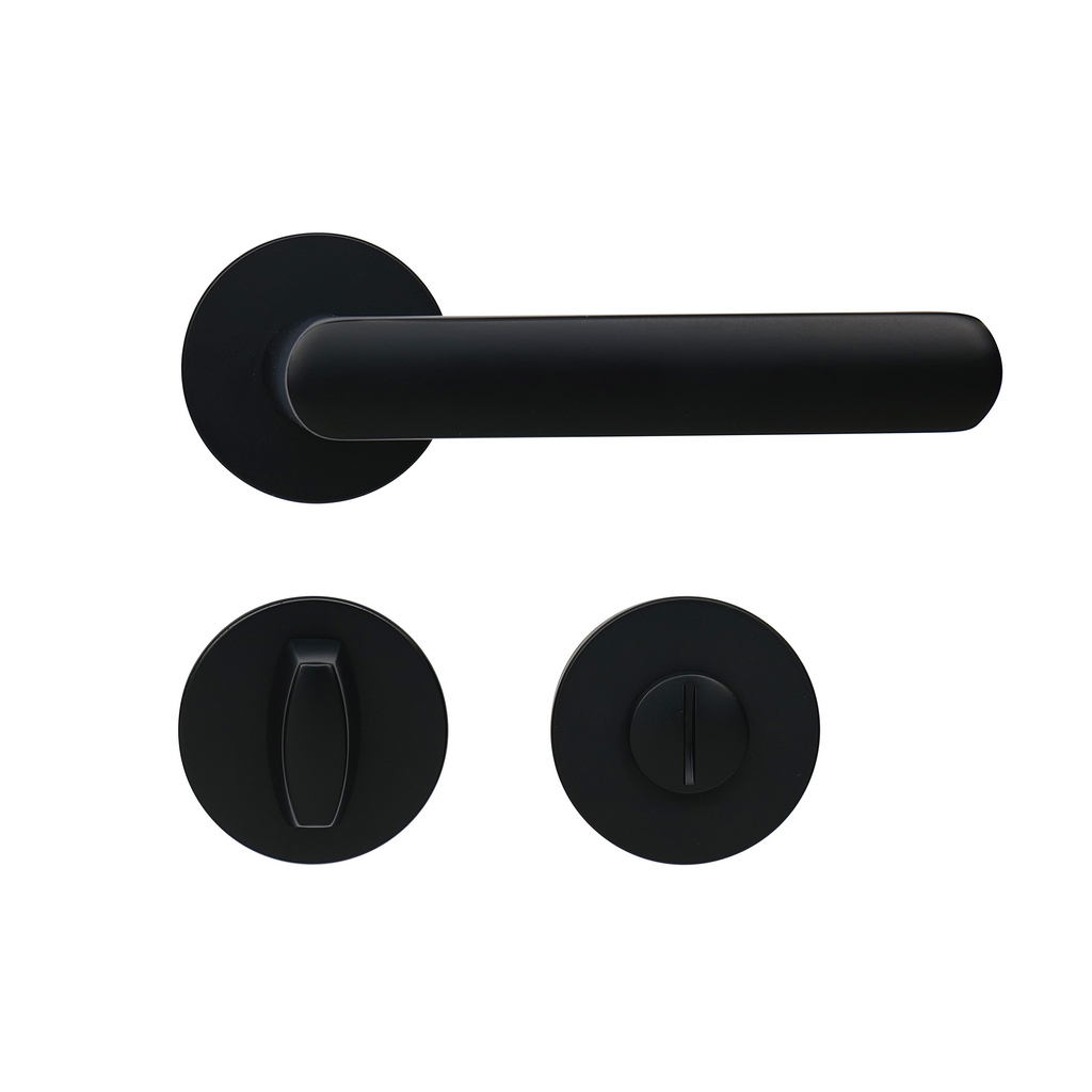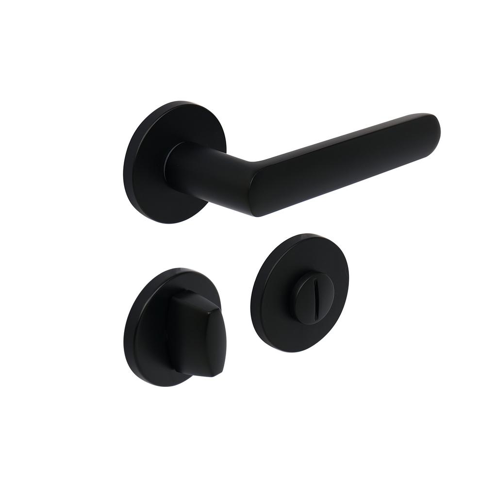 Dveřní kování na kulatých rozetách představuje moderní klasiku, která neurazí v žádném interiéru. Tento model nabízí konfiguraci klika + klika a rozetu s WC zámkem.