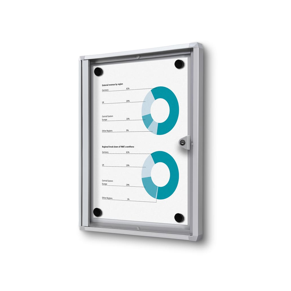 Vitrína ve formátu 1 x A4 disponuje magnetickým popisovatelným povrchem. Ten je určen pro popisování za sucha stíratelnými popisovači. Kromě psaní však můžete využít také magnetů pro připnutí všech důležitých dokumentů, které tak budete mít stále na očích.