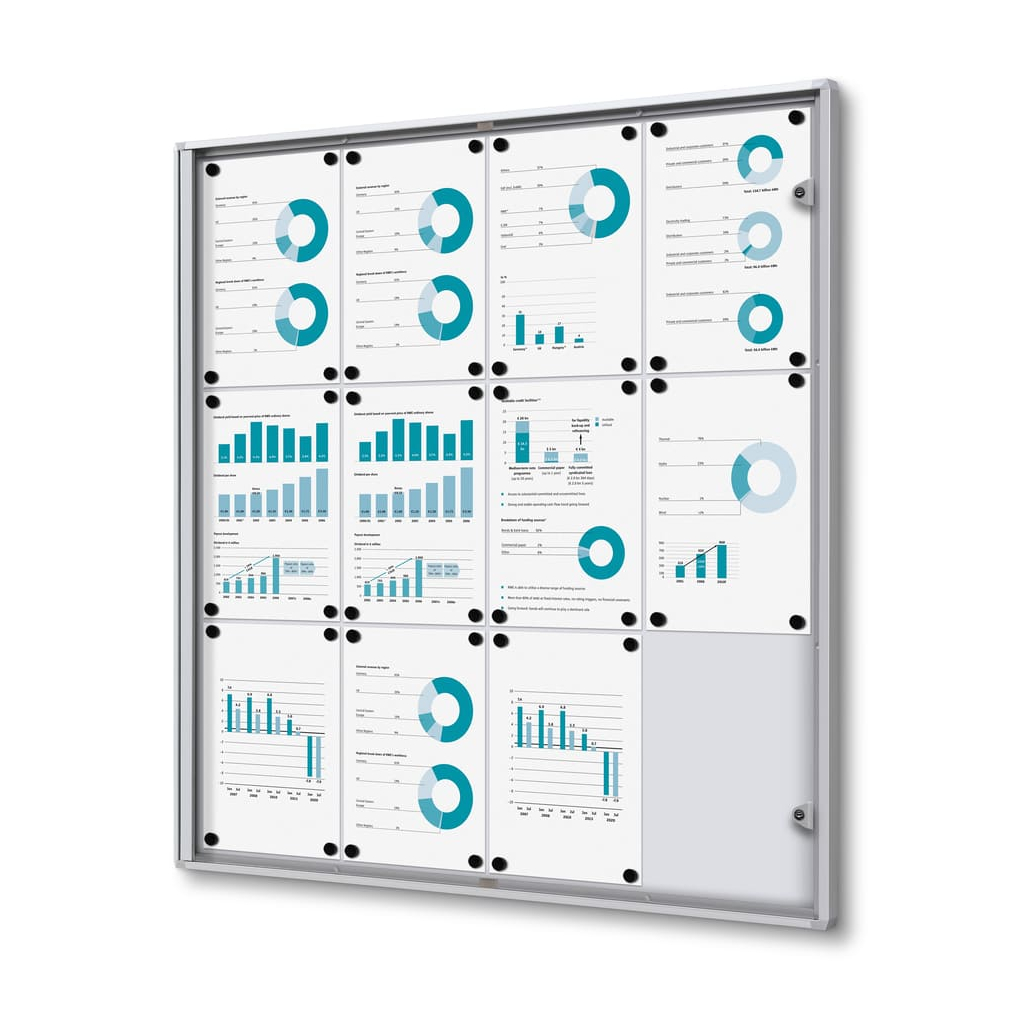 Vitrína ve formátu 12 x A4 disponuje magnetickým popisovatelným povrchem. Ten je určen pro popisování za sucha stíratelnými popisovači. Kromě psaní však můžete využít také magnetů pro připnutí všech důležitých dokumentů, které tak budete mít stále na očích.