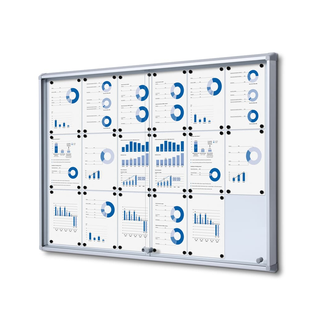 Vitrína ve formátu 18 x A4 disponuje magnetickým popisovatelným povrchem. Ten je určen pro popisování za sucha stíratelnými popisovači. Kromě psaní však můžete využít také magnetů pro připnutí všech důležitých dokumentů, které tak budete mít stále na očích.