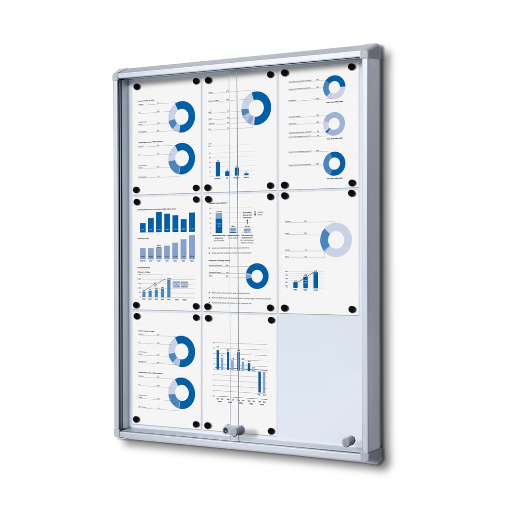 Vitrína ve formátu 9 x A4 disponuje magnetickým popisovatelným povrchem. Ten je určen pro popisování za sucha stíratelnými popisovači. Kromě psaní však můžete využít také magnetů pro připnutí všech důležitých dokumentů, které tak budete mít stále na očích.