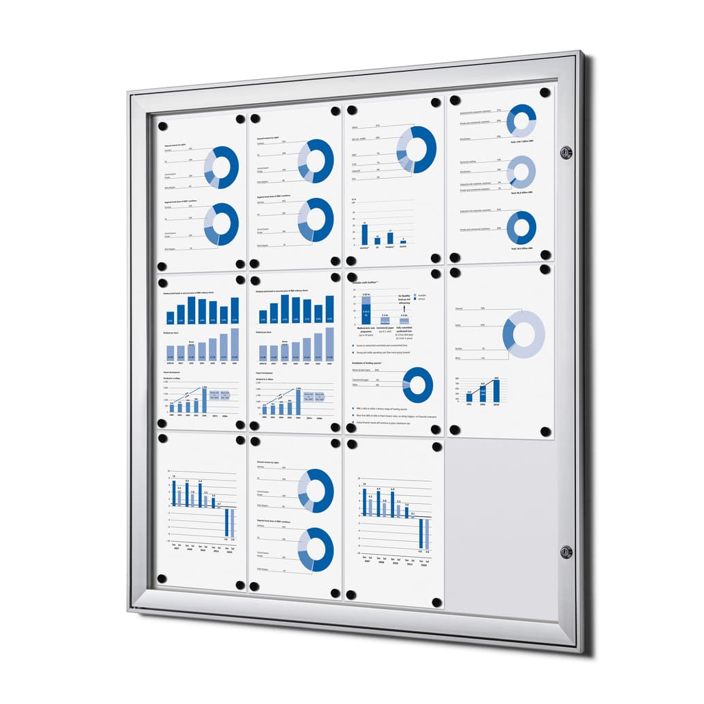 Vitrína ve formátu 12 x A4 disponuje magnetickým popisovatelným povrchem. Ten je určen pro popisování za sucha stíratelnými popisovači. Kromě psaní však můžete využít také magnetů pro připnutí všech důležitých dokumentů, které tak budete mít stále na očích.