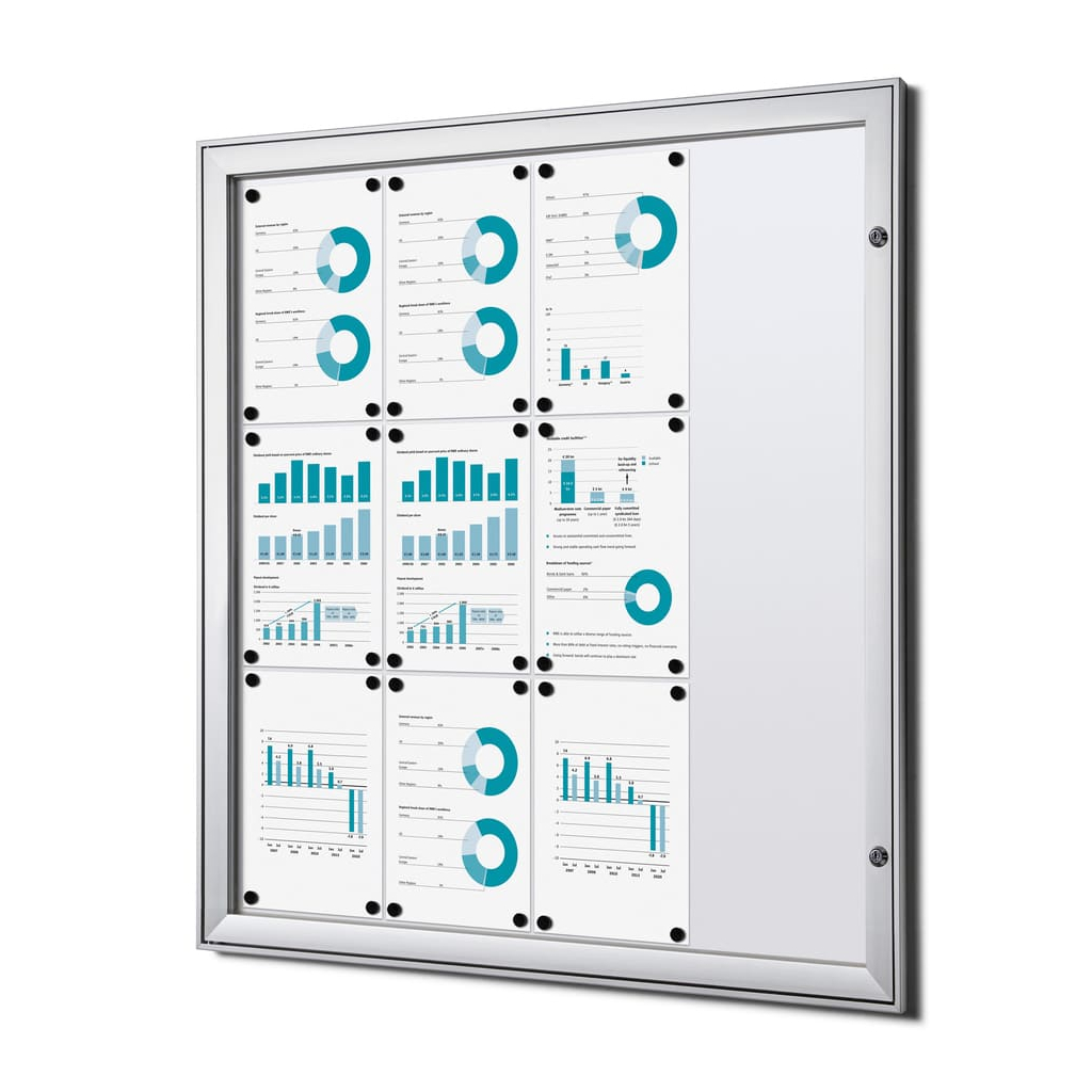 Vitrína ve formátu 12 x A4 disponuje magnetickým popisovatelným povrchem. Ten je určen pro popisování za sucha stíratelnými popisovači. Kromě psaní však můžete využít také magnetů pro připnutí všech důležitých dokumentů, které tak budete mít stále na očích.