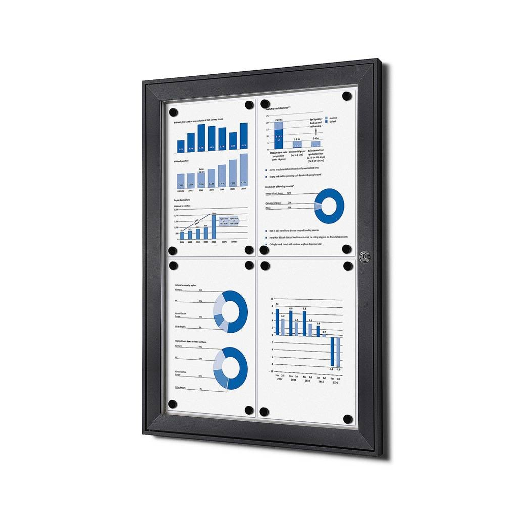 Vitrína ve formátu 4 x A4 disponuje magnetickým popisovatelným povrchem. Ten je určen pro popisování za sucha stíratelnými popisovači. Kromě psaní však můžete využít také magnetů pro připnutí všech důležitých dokumentů, které tak budete mít stále na očích.