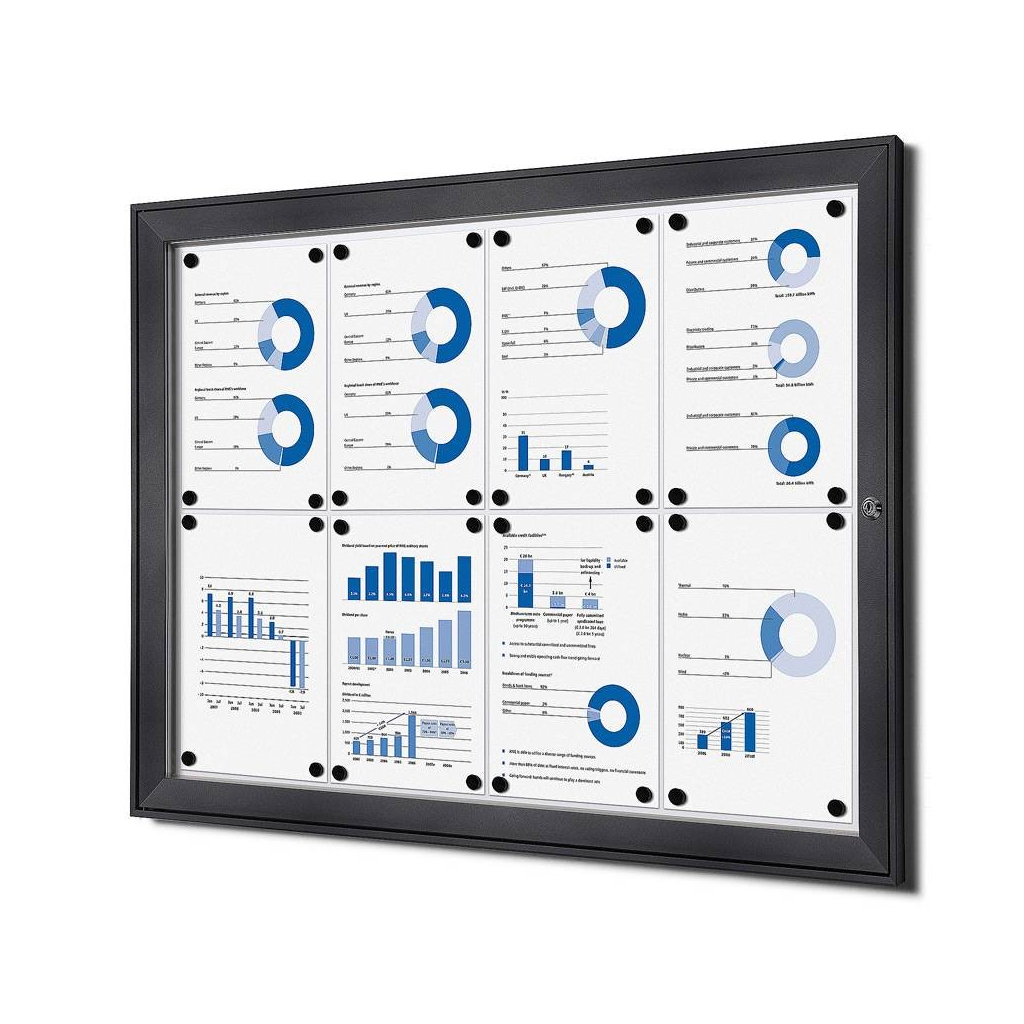 Vitrína ve formátu 8 x A4 disponuje magnetickým popisovatelným povrchem. Ten je určen pro popisování za sucha stíratelnými popisovači. Kromě psaní však můžete využít také magnetů pro připnutí všech důležitých dokumentů, které tak budete mít stále na očích.