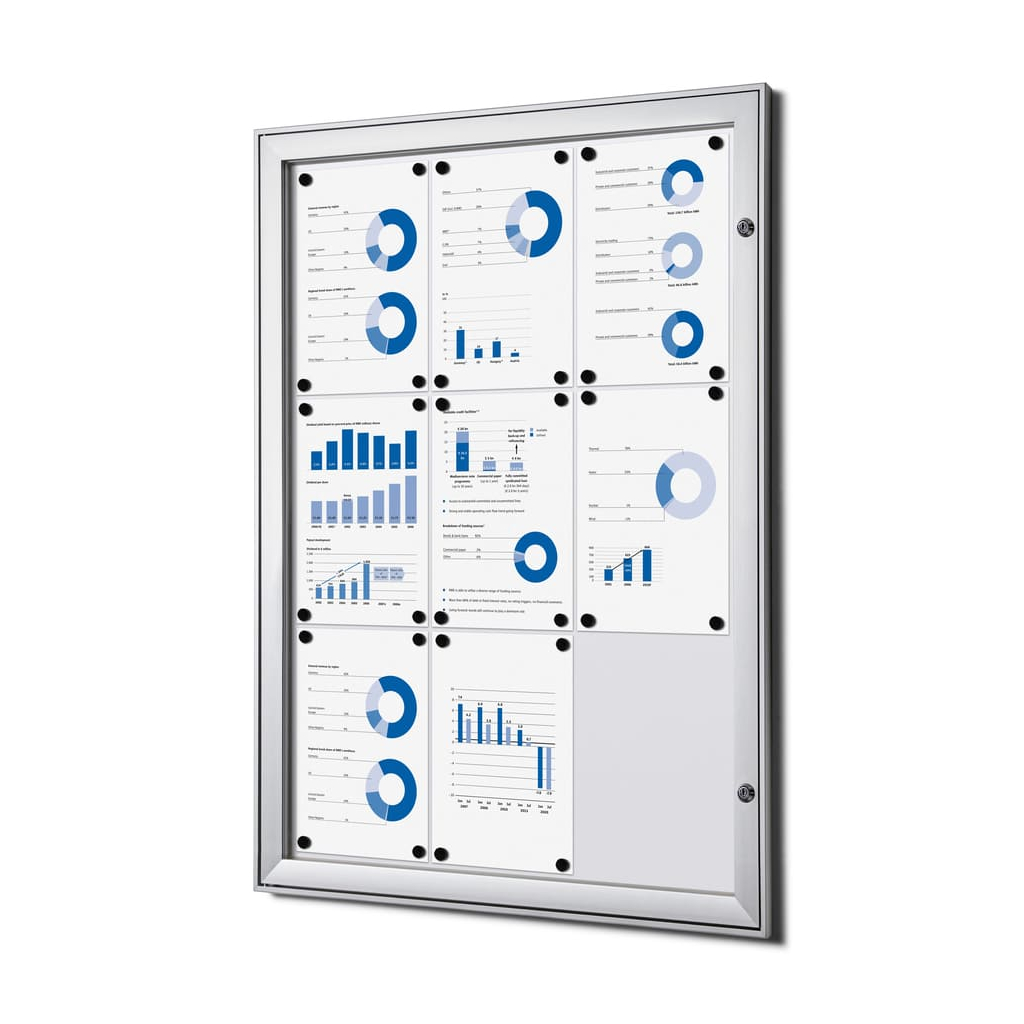 Vitrína ve formátu 9 x A4 disponuje magnetickým popisovatelným povrchem. Ten je určen pro popisování za sucha stíratelnými popisovači. Kromě psaní však můžete využít také magnetů pro připnutí všech důležitých dokumentů, které tak budete mít stále na očích.