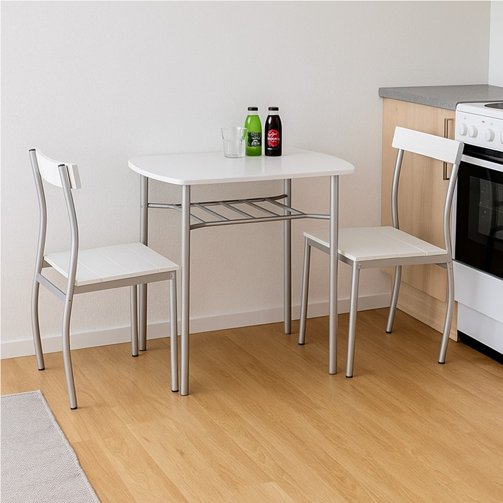 Set se skládá z oválného jídelního stolu a 2 židlí. Deska stolu je stejně jako sedák a opěrák židle vyrobena z dřevovláknitých desek. Konstrukce jsou z pevného kovu a zajistí tak výbornou stabilitu. Nosnost židlí v sestavě je 110 kg.